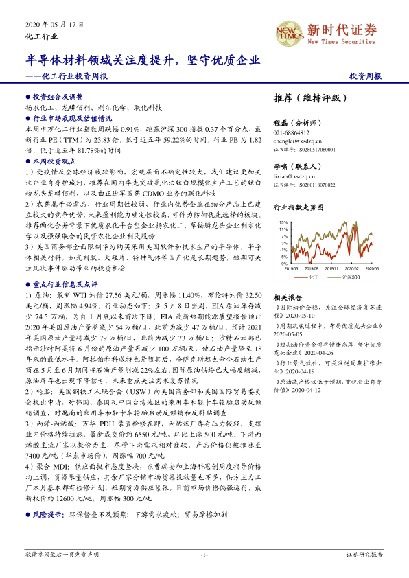 本报告对2020年5月17日化工行业,特别是半导体材料领域进行了市场分析。报告在宏观经济环境不确定性较大的背景下,建议投资者关注企业自身护城河,选择具有核心竞争优势的优质企业。报告推荐了几个重点关注的化工企业,并分析了行业估值水平、外资持仓变化以及主要化工产品的价格走势和市场动态。同时,报告也指出了化工行业面临的风险。 报告认为,半导体材料国产化是长期趋势,短期内也存在投资机会。 总而言之,报告为投资者提供了化工行业投资的参考依据。