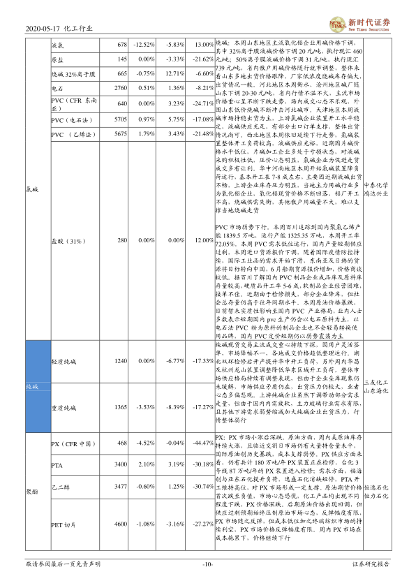 报告分析了上周(2020年5月11日至15日)化工行业个股的涨跌情况,化妆品相关个股涨幅居前,而受美国对东南亚等国轮胎展开双反调查的影响,轮胎相关个股跌幅较大。(表1详细列出了个股涨跌幅前十名)。