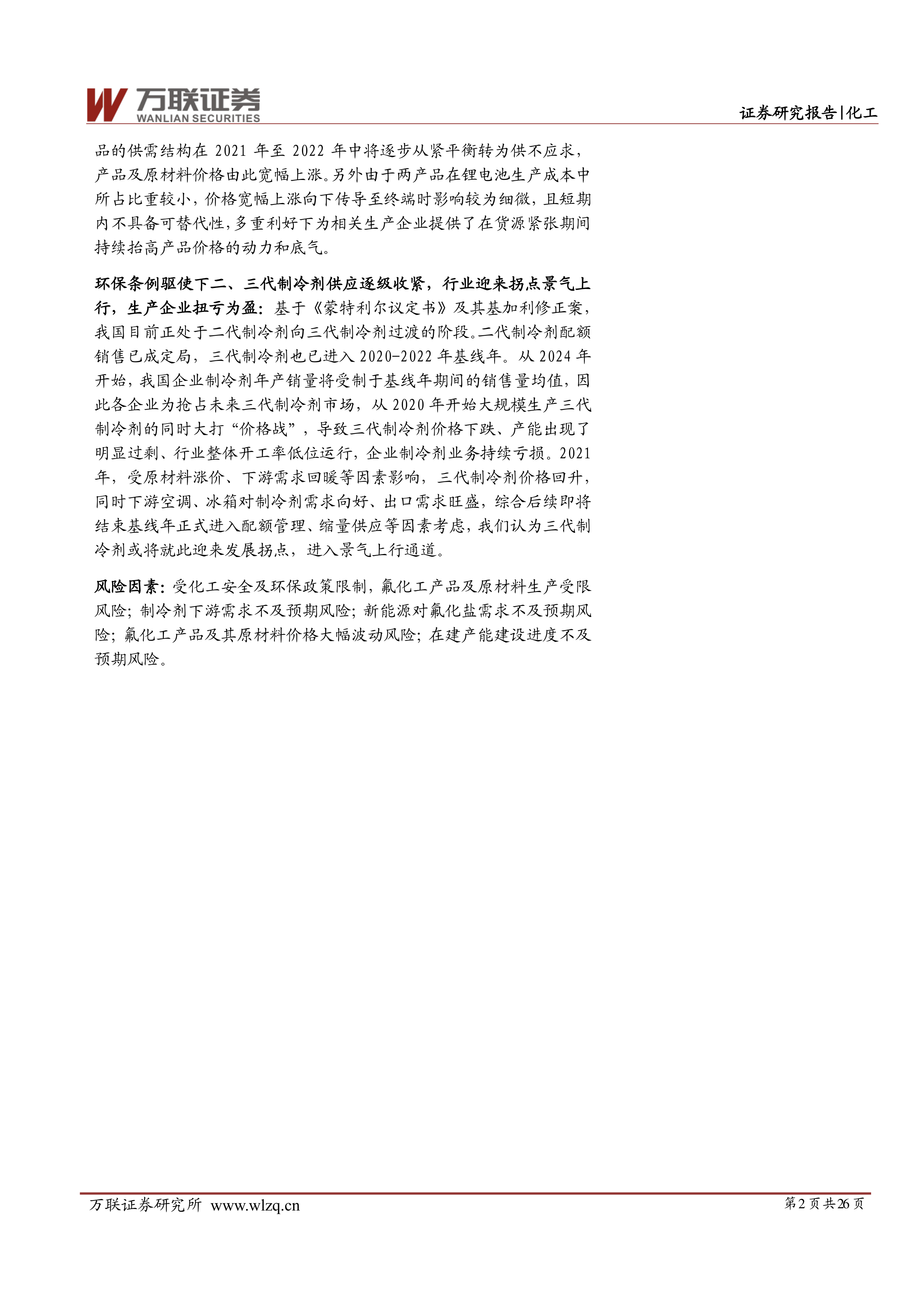 1.在海外产量大幅削减导致出口需求增长、国内空调/冰箱等终端需求稳健等利好条件下,我国已进入三代制冷剂基线年。从前期制冷剂生产企业不惜亏损也要压低价格抢占市场的决心,叠加国内碳中和、碳达峰等政策对供给端的限制,未来三代制冷剂或将达到全新的景气及价格高点,且本轮上行周期有望拉得更长。