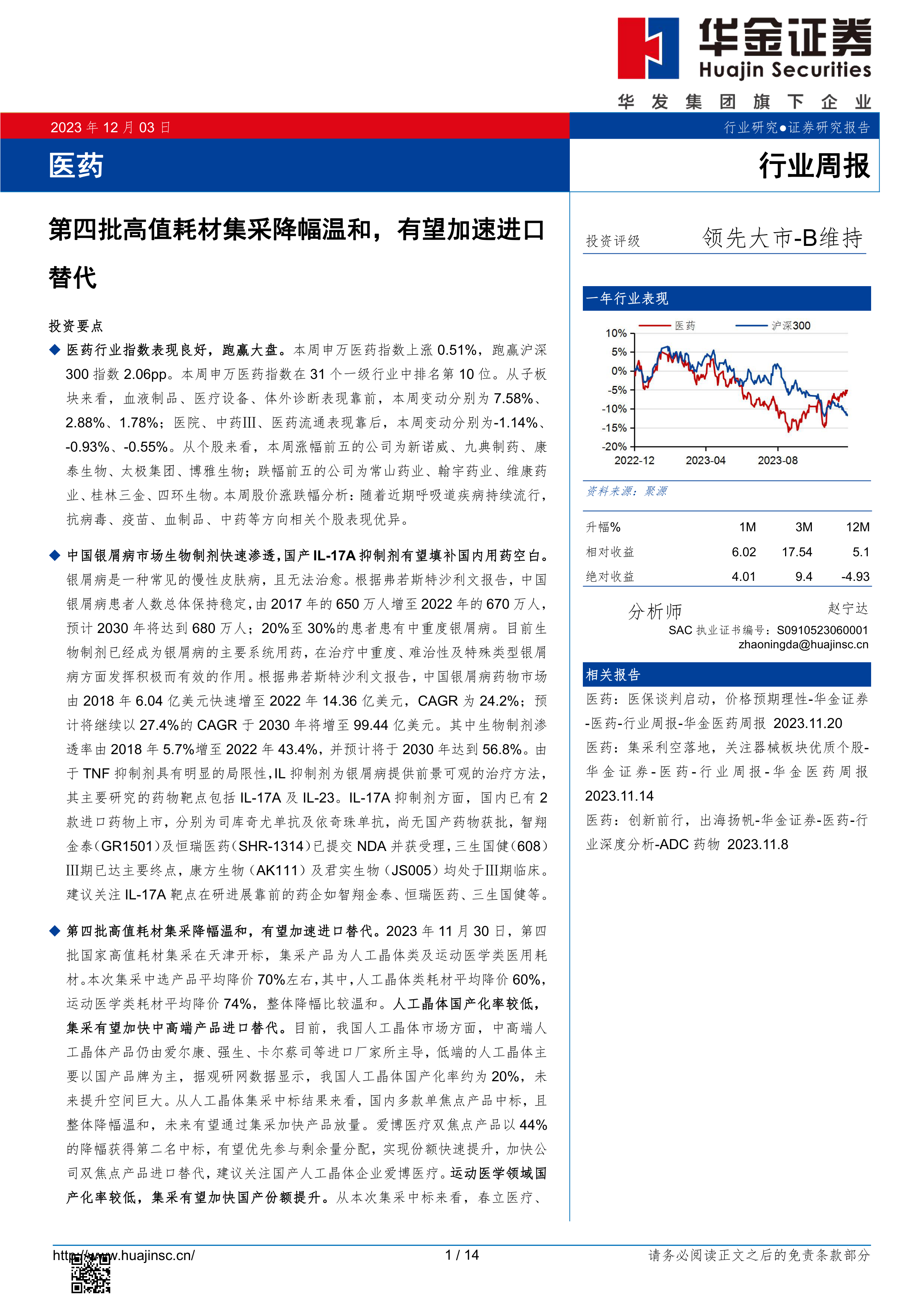 本报告分析了医药行业近期行情,重点关注了银屑病生物制剂市场和高值耗材集采对行业的影响。数据显示,医药行业整体向好,但板块和个股分化明显。银屑病生物制剂市场增长迅速,国产替代空间巨大,高值耗材集采降幅温和,利好进口替代。 报告最后给出了医药行业投资建议,并提示了相关风险。 长期来看,医药行业发展前景良好,但投资者需谨慎评估风险,理性投资。
