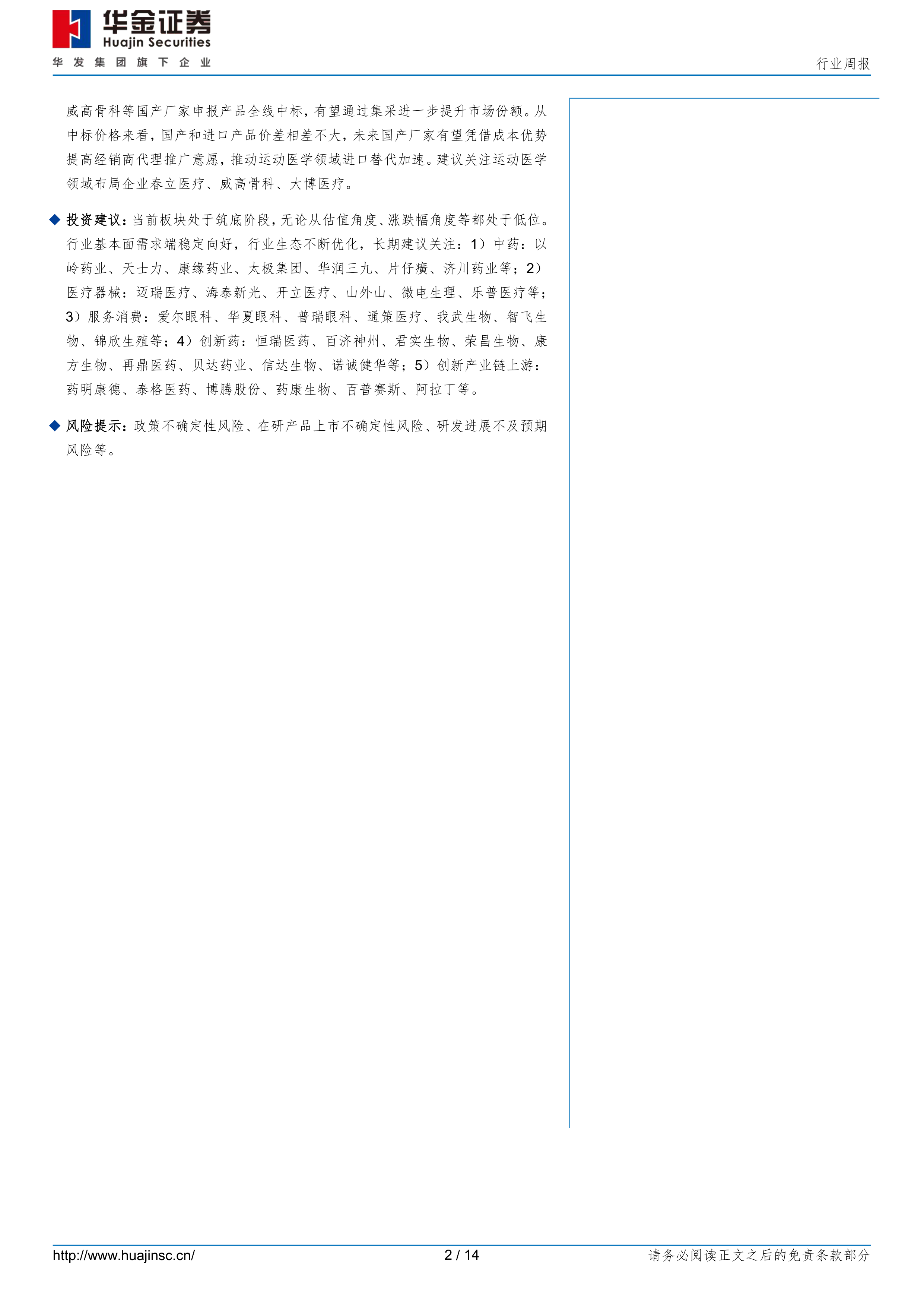 投资建议:当前板块处于筑底阶段,无论从估值角度、涨跌幅角度等都处于低位。行业基本面需求端稳定向好,行业生态不断优化,长期建议关注:1)中药:以岭药业、天士力、康缘药业、太极集团、华润三九、片仔癀、济川药业等;2)医疗器械:迈瑞医疗、海泰新光、开立医疗、山外山、微电生理、乐普医疗等;