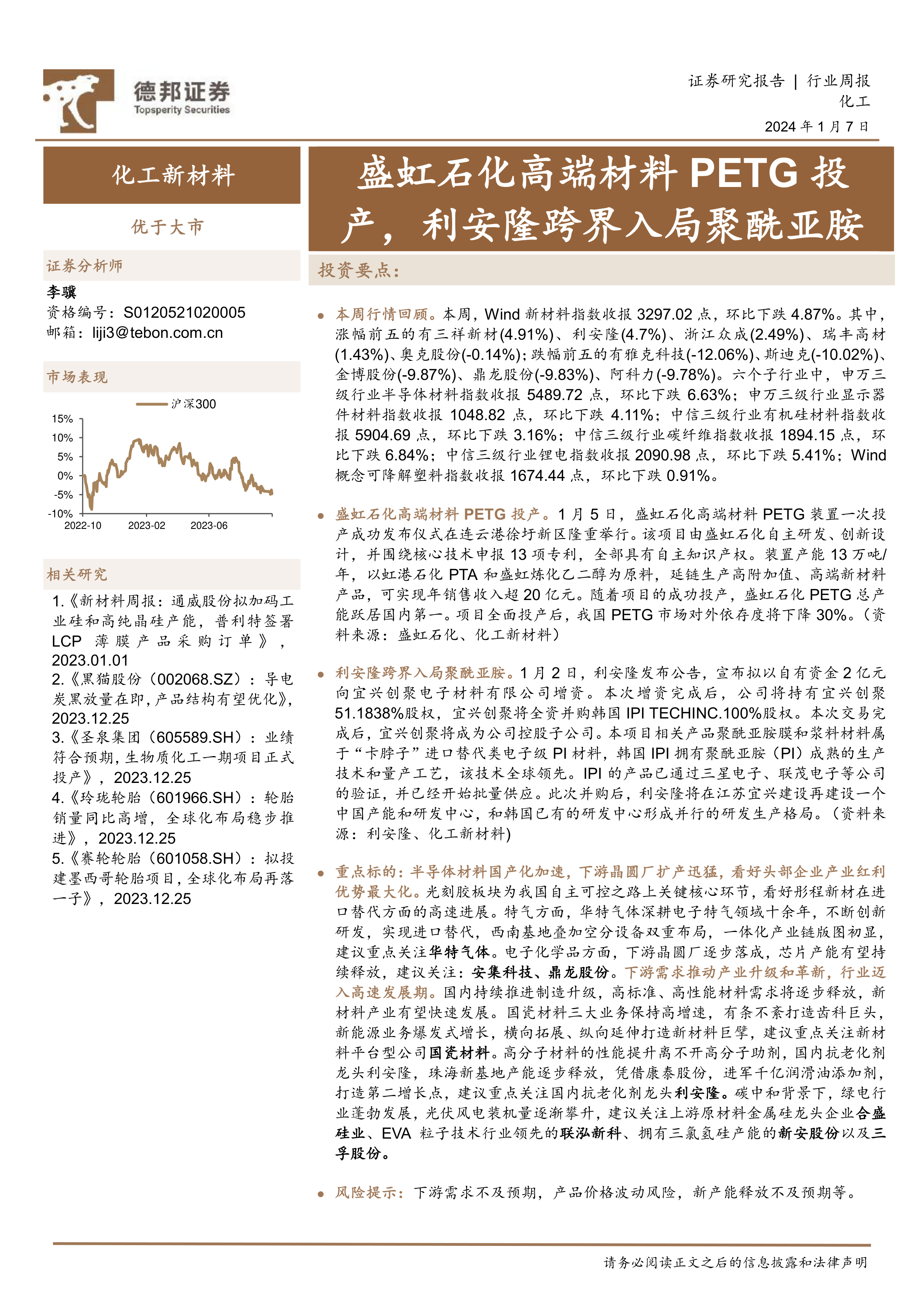 报告重点关注了盛虹石化PETG投产和利安隆跨界进入聚酰亚胺领域两大事件,并对相关公司及其他重点公司的周行情进行了分析。