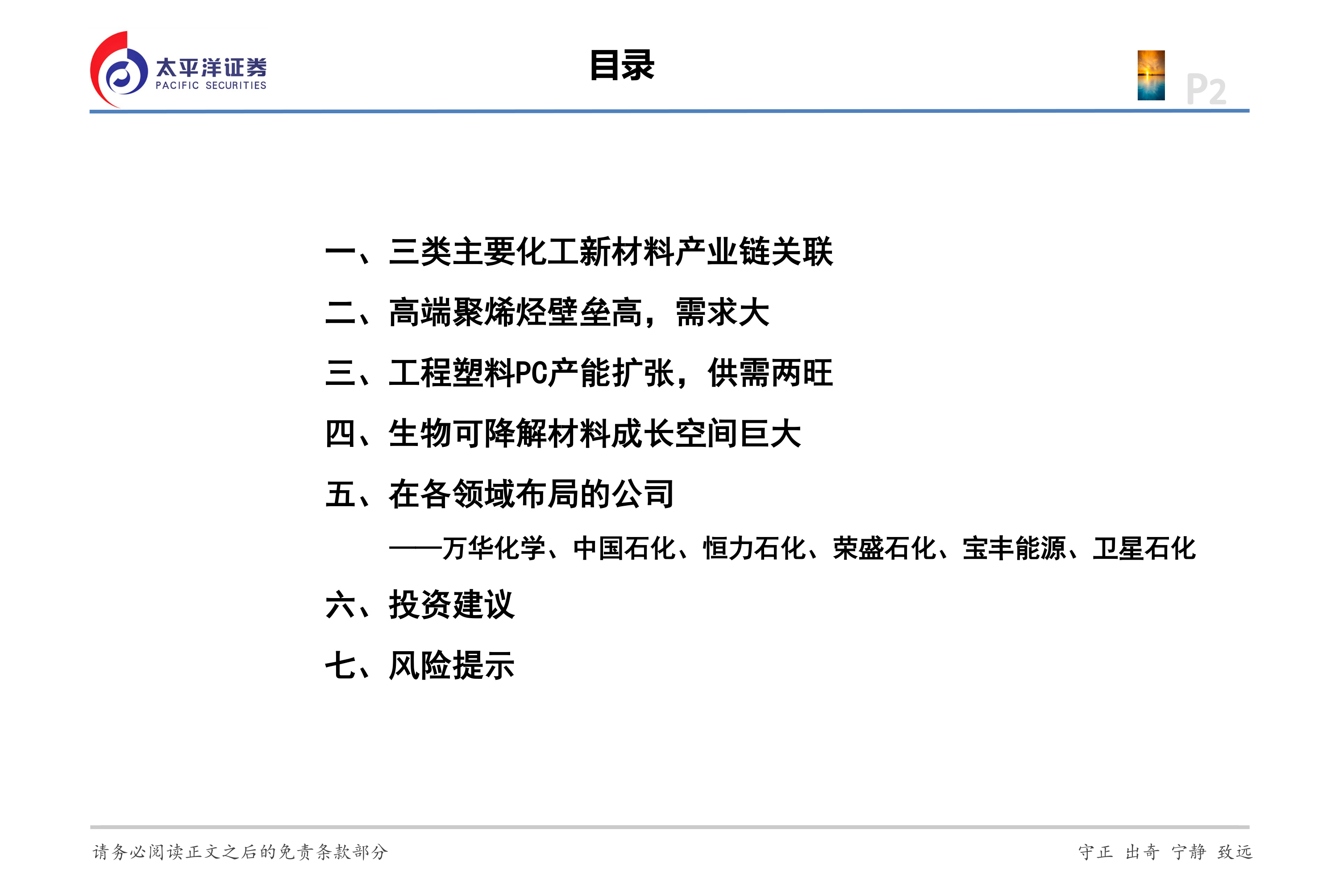 3、建议关注:(1)在三个领域均有布局的万华化学,(2)在高端聚烯烃研发和工业化领域处于国内领先的中国石化,(3)在生物可降解材料领域布局的恒力石化,(4)在高端聚烯烃及PC领域布局的荣盛石化,(5)在高端聚烯烃多个细分领域布局的宝丰能源,(6)在EAA领域布局的卫星石化。