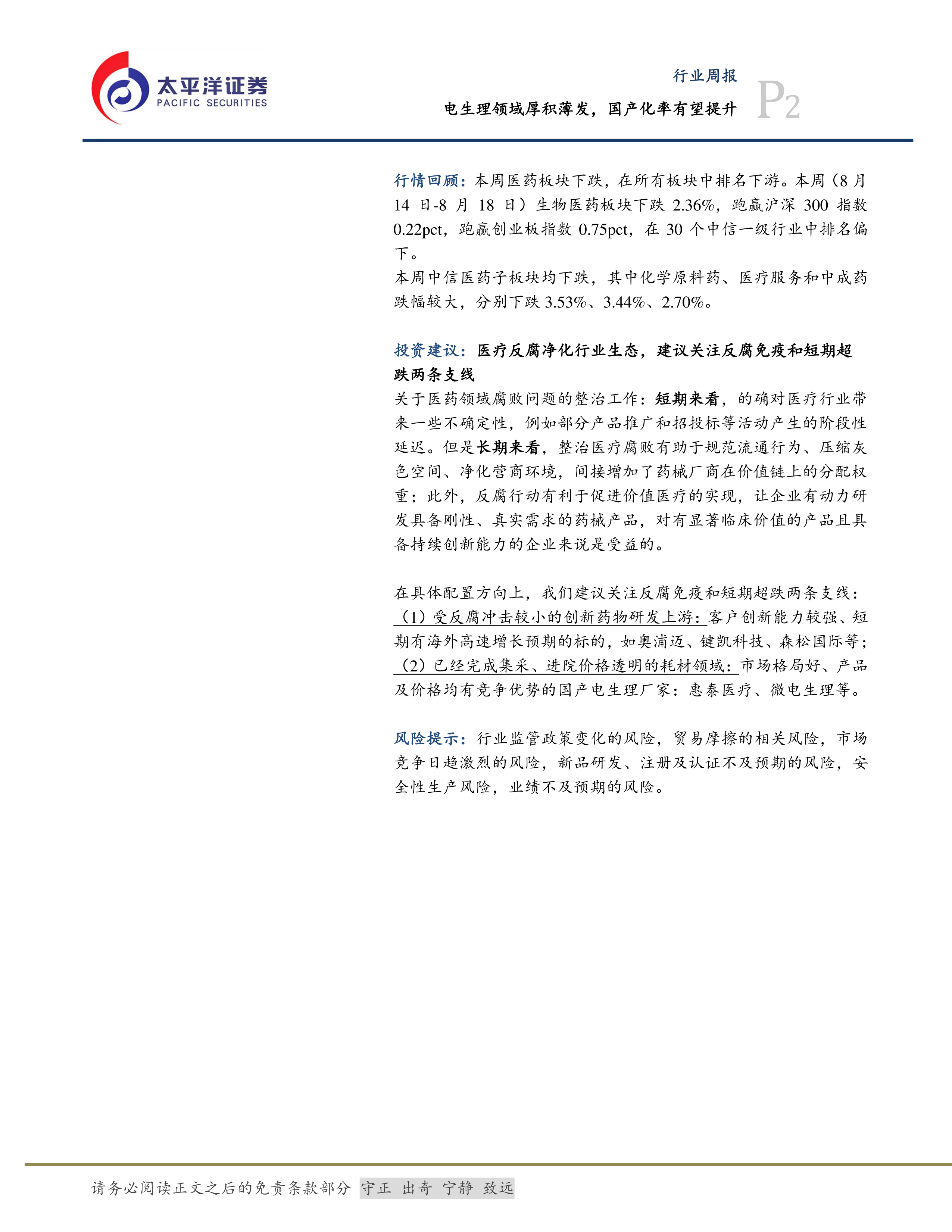报告建议关注“反腐免疫”和“短期超跌”两条投资支线,分别推荐了在创新药物研发上游和已完成集采的耗材领域(例如国产电生理厂家)的投资标的。 报告同时列出了潜在的风险因素,例如行业监管政策变化、市场竞争加剧以及产品研发风险等。 报告还提供了对医药行业整体的长期投资观点,建议配置高性价比的景气类资产,并对创新药产业链、创新器械、先进制造和疫后复苏等细分领域进行了分析,并推荐了相应的投资标的。
