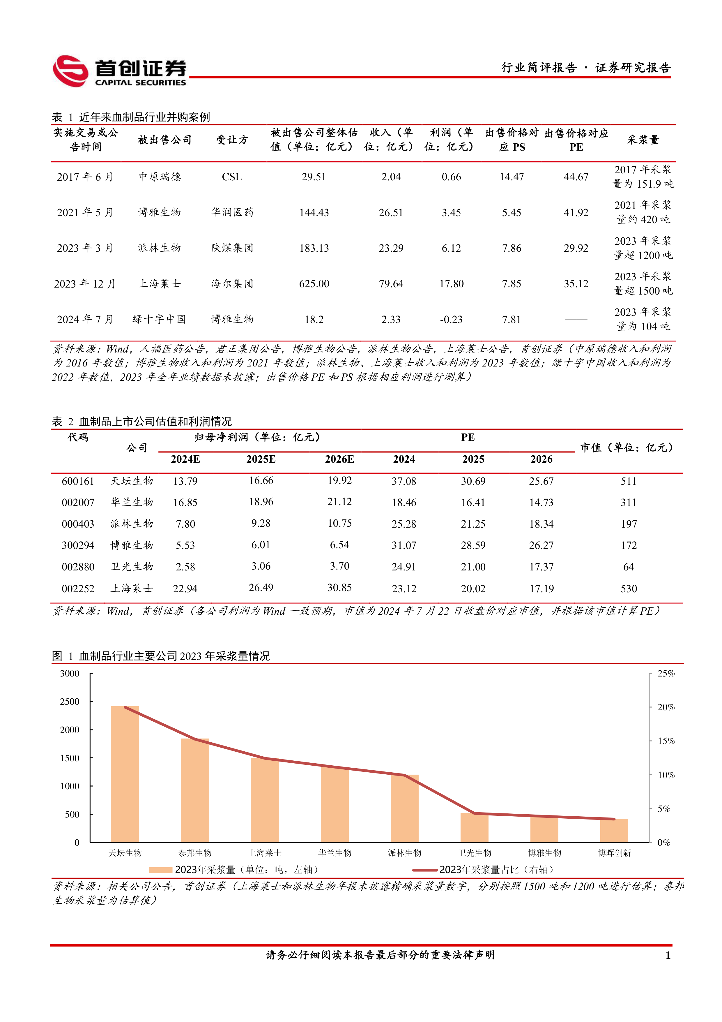现阶段血制品行业上市公司估值有修复空间,业绩具有较好的成长性。我们对比了近年来血制品行业并购案例,可以看出相关并购的PE和PS均处于较高水平,体现出产业资本对于血制品行业价值的认可。与并购案例的估值相比,目前血制品行业上市公司2024年预期利润对应的PE已经出现一定幅度折价,因此我们认为现阶段血制品行业上市公司的估值有修复空间,安全边际充足。另一方面,2023年我国采浆量实现了较快增长,浆源充足,能够较好的匹配终端需求;同时由于疫情强化了医生和患者对于静丙、白蛋白等血制品临床价值的认知度,预计需求增速中枢有所提升,血制品行业上市公司业绩端也具有较好的成长性和确定性。