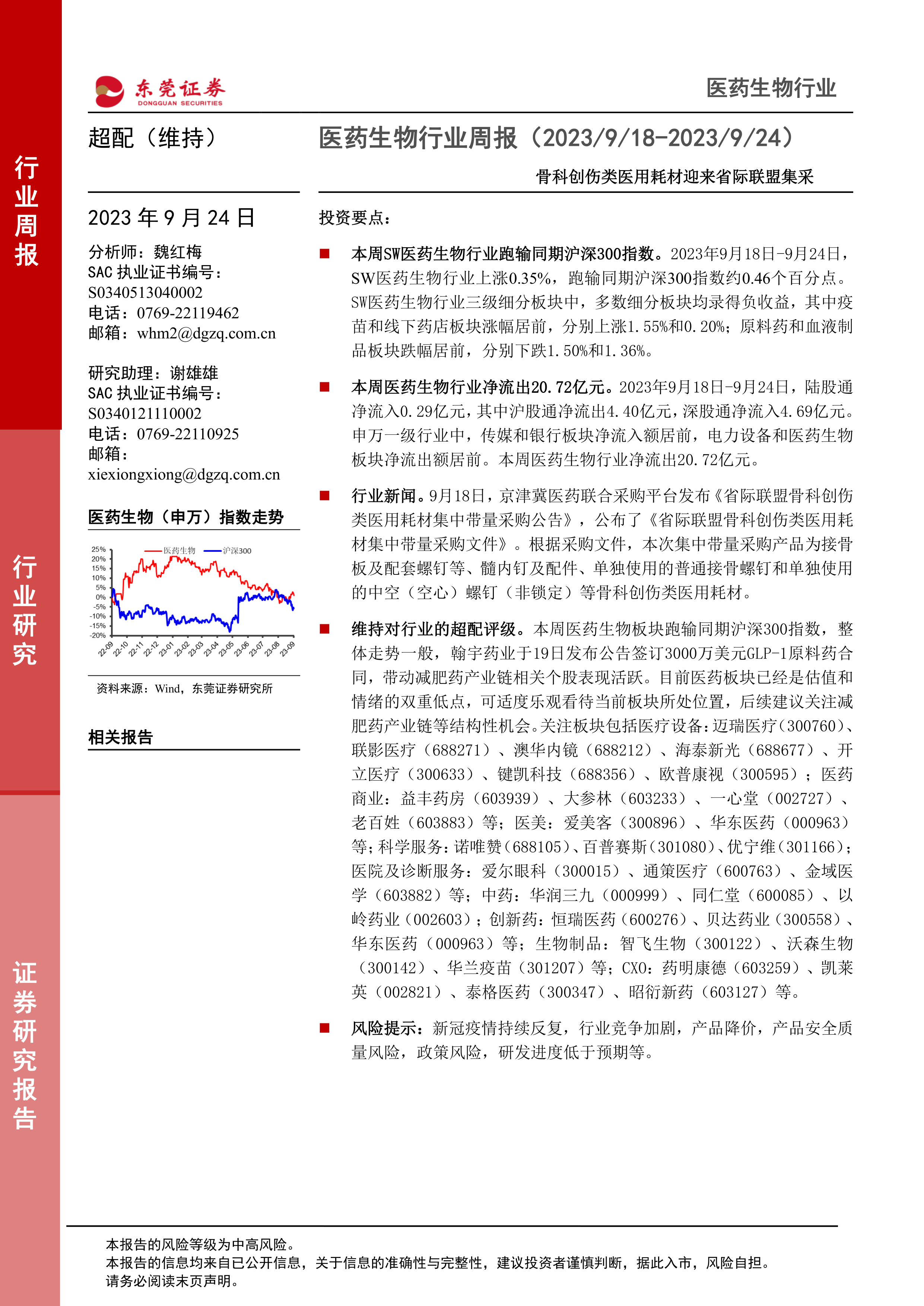 本报告对2023年9月18日至2023年9月24日一周的医药生物行业进行了全面分析。尽管本周行业整体表现逊于大盘,但考虑到估值处于历史低位,以及部分细分领域展现出的结构性机会,报告维持对该行业的超配评级。 报告详细分析了行业行情、资金流向、重要新闻和上市公司公告,并提供了具体的投资建议和风险提示,为投资者提供了较为全面的参考信息。 投资者应结合自身风险承受能力和投资目标,谨慎决策。 需要注意的是,本报告信息基于公开信息,其准确性和完整性无法完全保证,投资者需自行承担投资风险。
