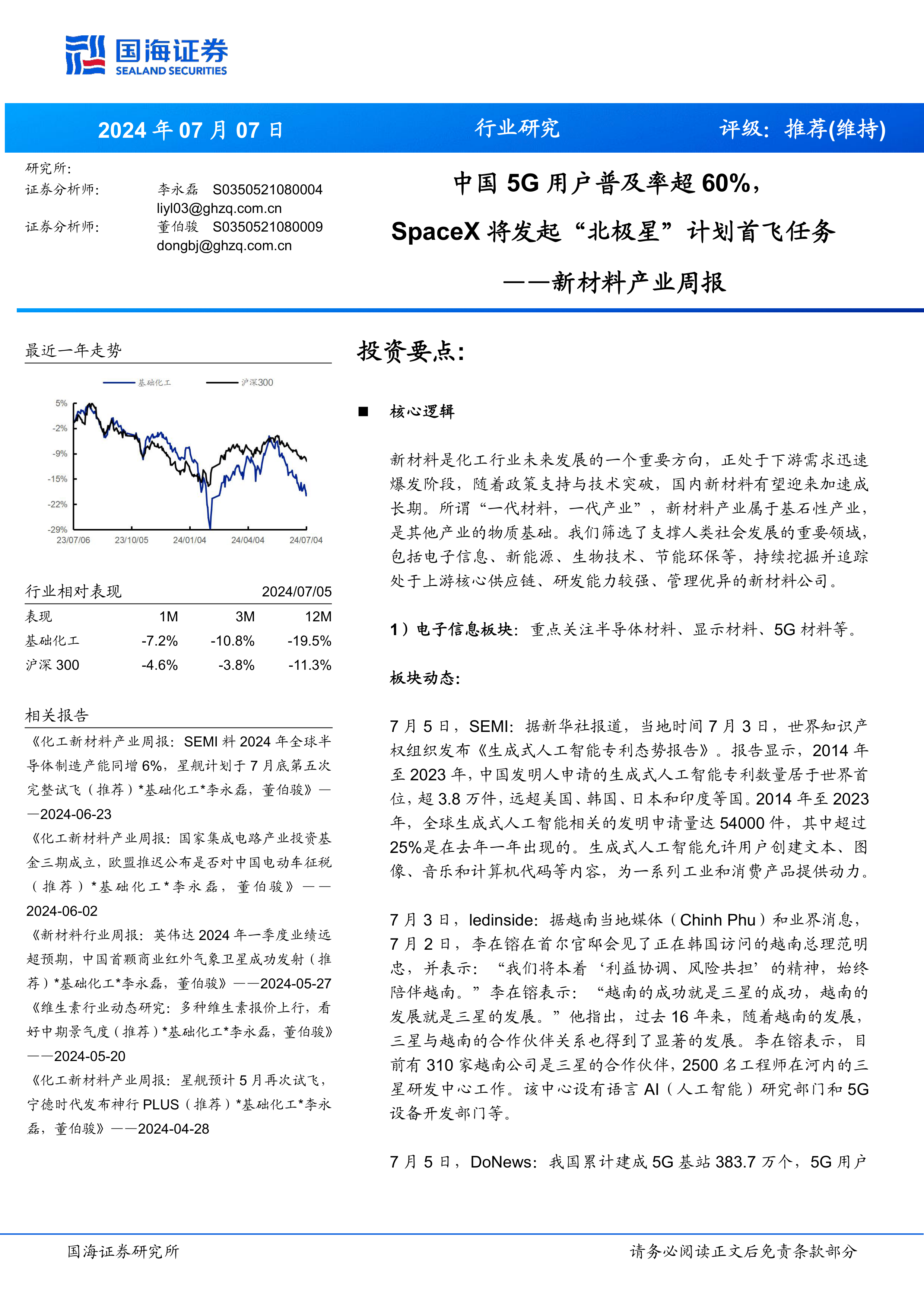 新材料产业周报:中国5G用户普及率超60%,SpaceX将发起“北极星”计划首飞任务