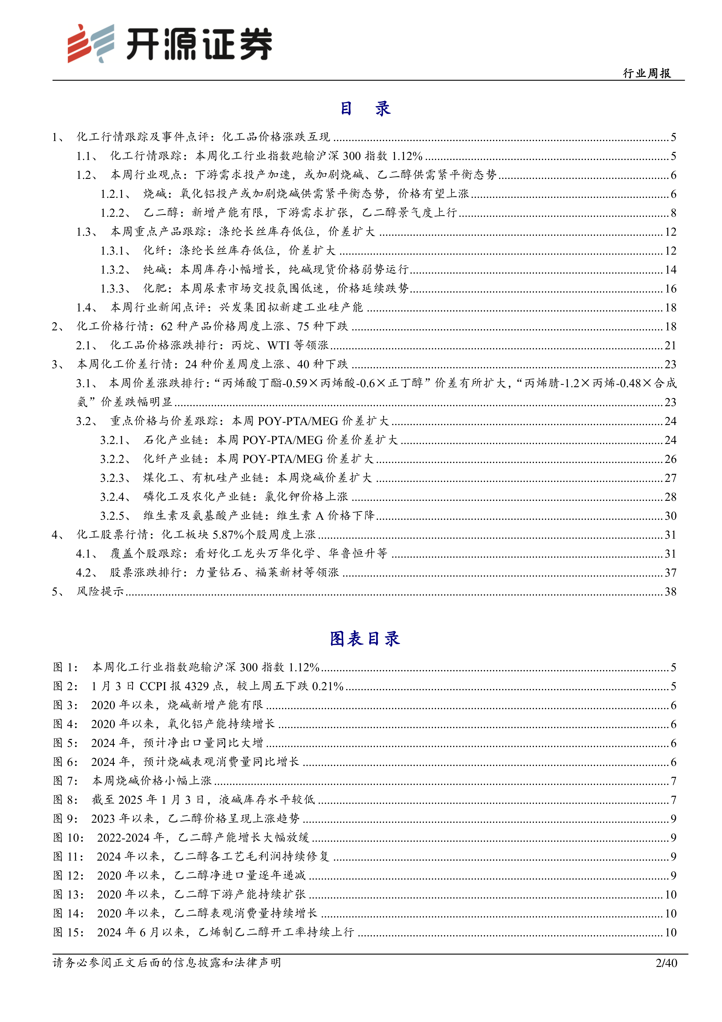 烧碱:根据百川盈孚数据,2025年H1,或新增氧化铝产能680万吨,或带动烧碱需求102万吨。2025年1-5月,烧碱的新增产能仅31.5万吨,主要的新增产能集中在2025年6月之后。因此新增氧化铝产能投产或加剧2025年1-5月烧碱供需紧平衡态势,烧碱价格或继续上涨。2026-2027年烧碱虽规划产能较多,但随着政策趋严、以及耗氯下游PVC景气度较低,烧碱未来新增产能落地难度或加大,长期来看,需关注烧碱新增产能的投放情况。【受益标的】新疆天业、氯碱化工、嘉化能源、英力特、雪天盐业、滨化股份、镇洋发展、日科化学等。乙二醇:根据百川盈孚数据,2025年1-5月,仅万凯新材120万吨乙二醇项目一期装置、宁夏鲲鹏40万吨乙二醇装置投产,乙二醇产能增量有限。需求端,2025年3月,将新增3套涤纶长丝装置,合计115万吨;2025年1月,将新增75万吨PET瓶片装置。2025年H1,涤纶长丝、PET瓶片新增产能或带动乙二醇需求63.65万吨。供需共振下,乙二醇景气度有望进一步上行。【受益标的】万凯新材、丹化科技、东方盛虹、卫星化学、荣盛石化、恒力石化。