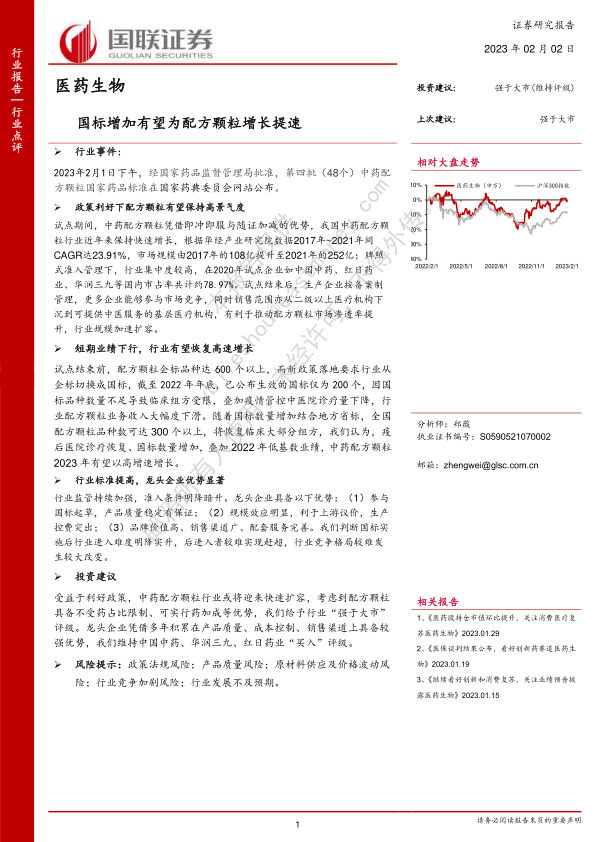 本报告的核心观点是:国家药品标准的增加将加速中药配方颗粒行业增长。尽管短期内受疫情影响业绩下行,但随着国家标准数量的增加、医院诊疗量的恢复以及2022年低基数效应,中药配方颗粒行业有望在2023年实现高速增长。龙头企业凭借其在产品质量、成本控制和销售渠道方面的优势,将在此过程中受益显著,行业竞争格局短期内难以发生重大改变。