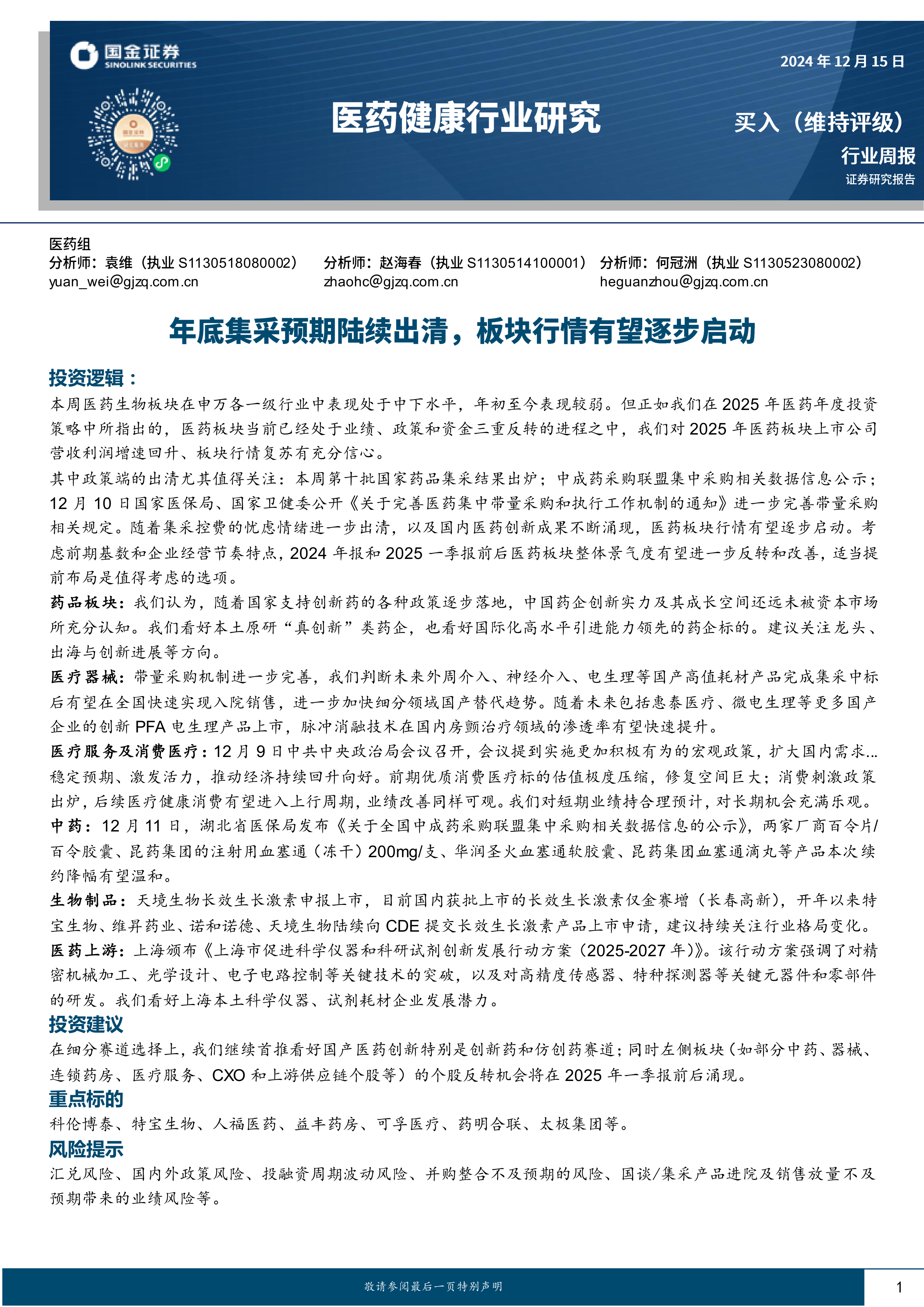 医药健康行业研究:年底集采预期陆续出清,板块行情有望逐步启动
