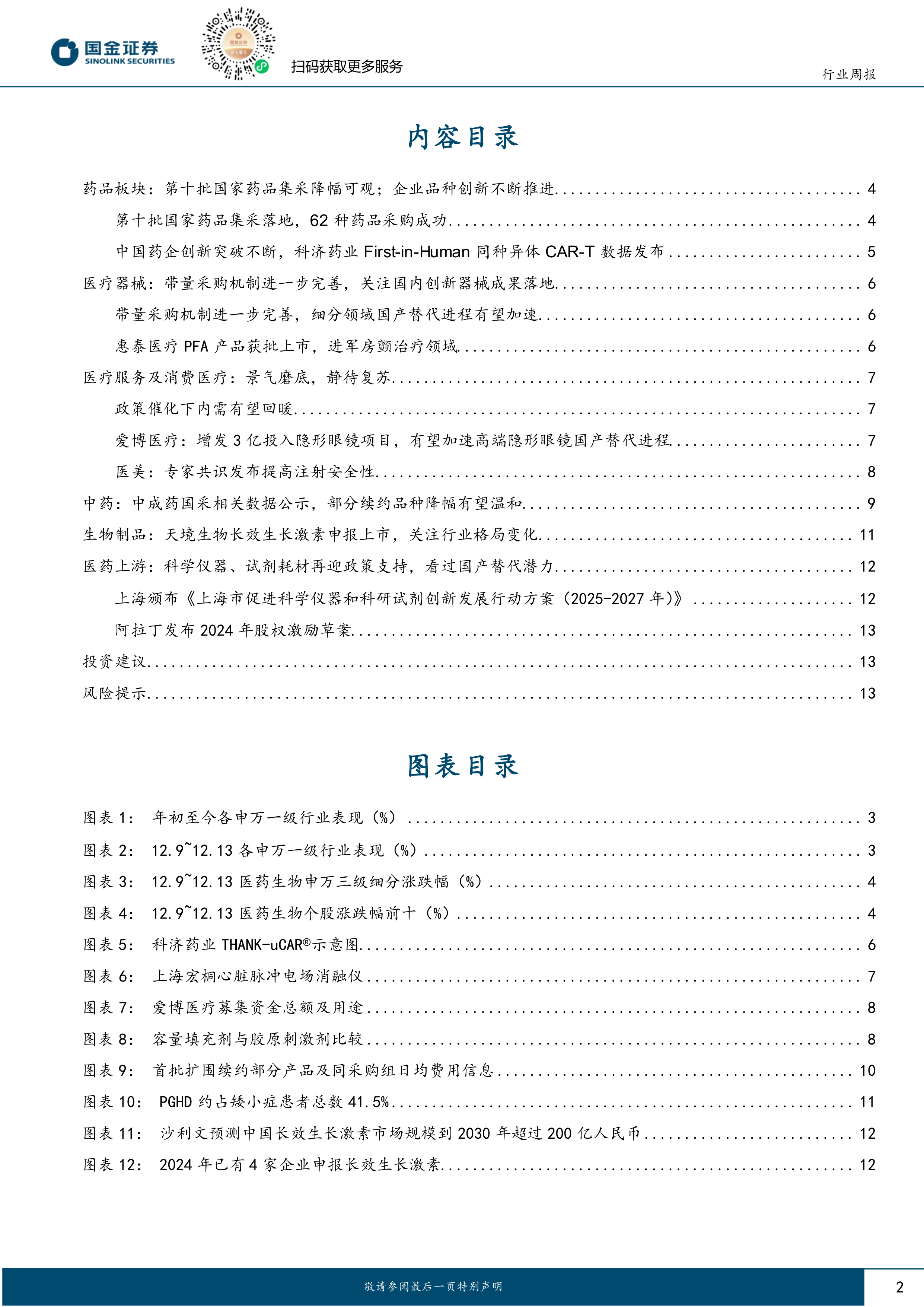本报告的核心观点是:尽管本周医药生物板块表现相对疲软,但基于业绩、政策和资金三重反转的预期,我们对2025年医药板块的复苏充满信心。 具体而言,政策端的积极变化(例如第十批国家药品集采结果出炉,带量采购机制完善等)将逐渐消除市场担忧,而国内医药创新成果的涌现将推动板块行情启动。我们建议提前布局,重点关注国产医药创新(特别是创新药和仿创药)、以及部分中药、器械、连锁药房、医疗服务、CXO和上游供应链等板块在2025年一季报前后可能出现的反转机会。