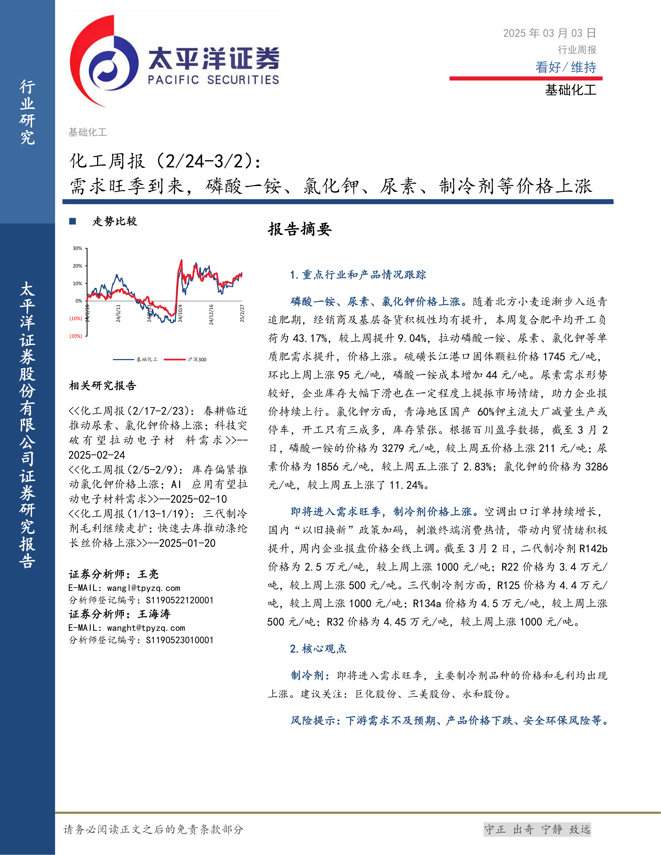 本报告的核心观点是:2025年2月24日至3月2日期间,受需求旺季到来以及部分产品供应紧张的影响,基础化工行业多个重点产品价格上涨,其中磷酸一铵、氯化钾、尿素和制冷剂涨幅显著。但部分产品如聚氨酯、草甘膦、部分食品添加剂和化学纤维价格出现下跌,行业整体呈现分化态势。建议关注制冷剂行业龙头企业,并密切关注下游需求变化及国际市场波动。