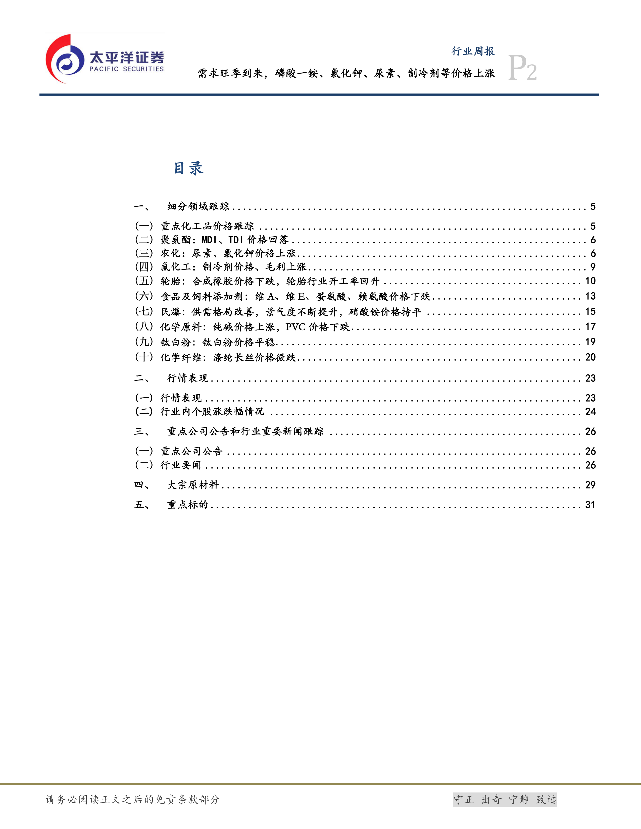 本部分详细跟踪了基础化工行业十个细分领域的市场表现,包括重点化工品价格、聚氨酯、农化、氟化工、轮胎、食品及饲料添加剂、民爆、化学原料、钛白粉和化学纤维等。
