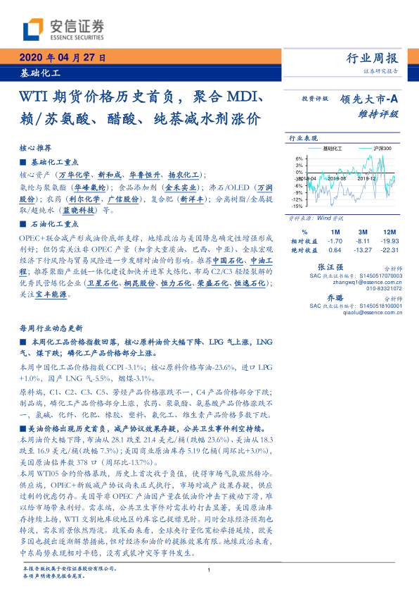 基础化工行业周报:WTI期货价格历史首负,聚合MDI、赖/苏氨酸、醋酸、纯萘减水剂涨价