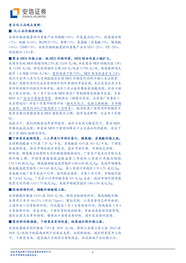 聚合 MDI 价格上涨、纯 MDI 价格回落,MDI 综合价差小幅扩大。本周华东纯 MDI 经销价跌 2.9%至 1 3250 元/吨,华东聚合 MDI 经销价涨 1.8%至 11500 元/吨。科思创周报价上调 200 元/吨至 11700 元/吨,瑞安最新周无报价(上周报 10300 元/吨) 。 原料纯苯下跌 9.9%,MDI 综合价差扩大 2.4% 。我们于去年八月与九月周报指出后续 MDI 价格变化的两个核心关注因素:其他厂商跟价情况与是否有预期外的外部强烈冲击出现。本次突发公共卫生事件即预期外的强烈外部冲击,海外 3 月以来的整体表现超预期,对出口造成了较大影响。而 3 月下旬以来 MDI 供应厂商则持续表现挺市态度,多家MDI 大厂近日不考核拿货量,限制供应(据隆众资讯,当前各厂商基本 5成负荷运行)并宣 5 月集中检修计划(据天天化工,包括上海联恒、万华烟台在内,国内约 40%产能或将于 5 月停车) ;据卓创某厂近两周对经销商不发货且建议经销商聚合 MDI 最低售价上调,挺市姿态鲜明、与去年 4 月相似。