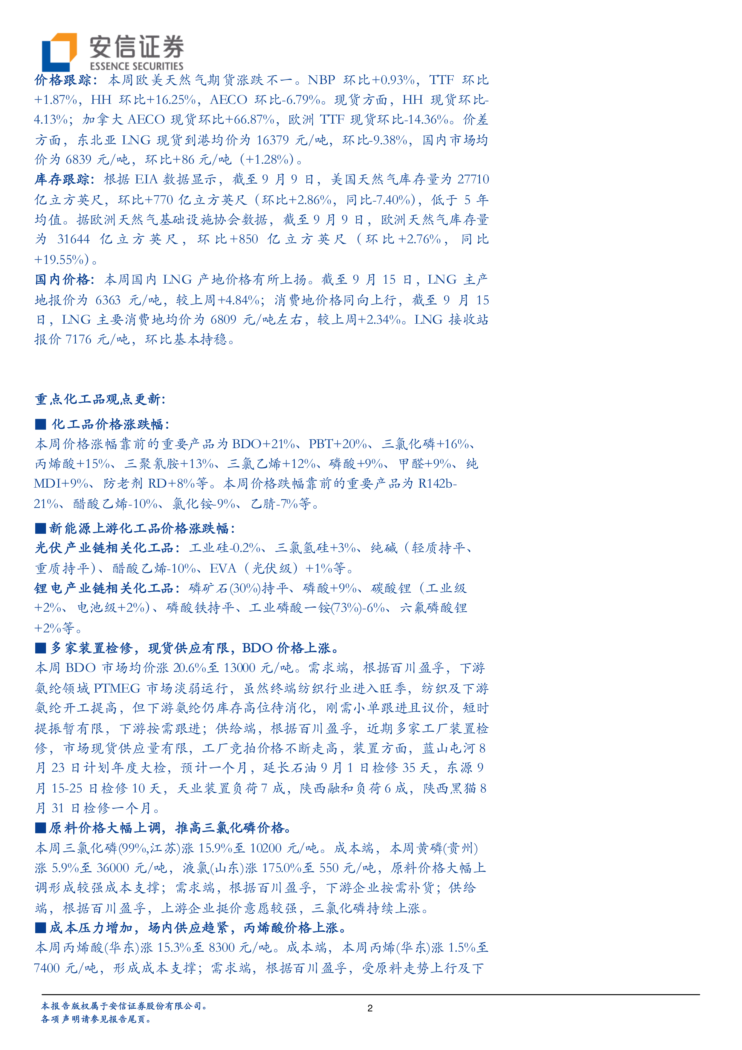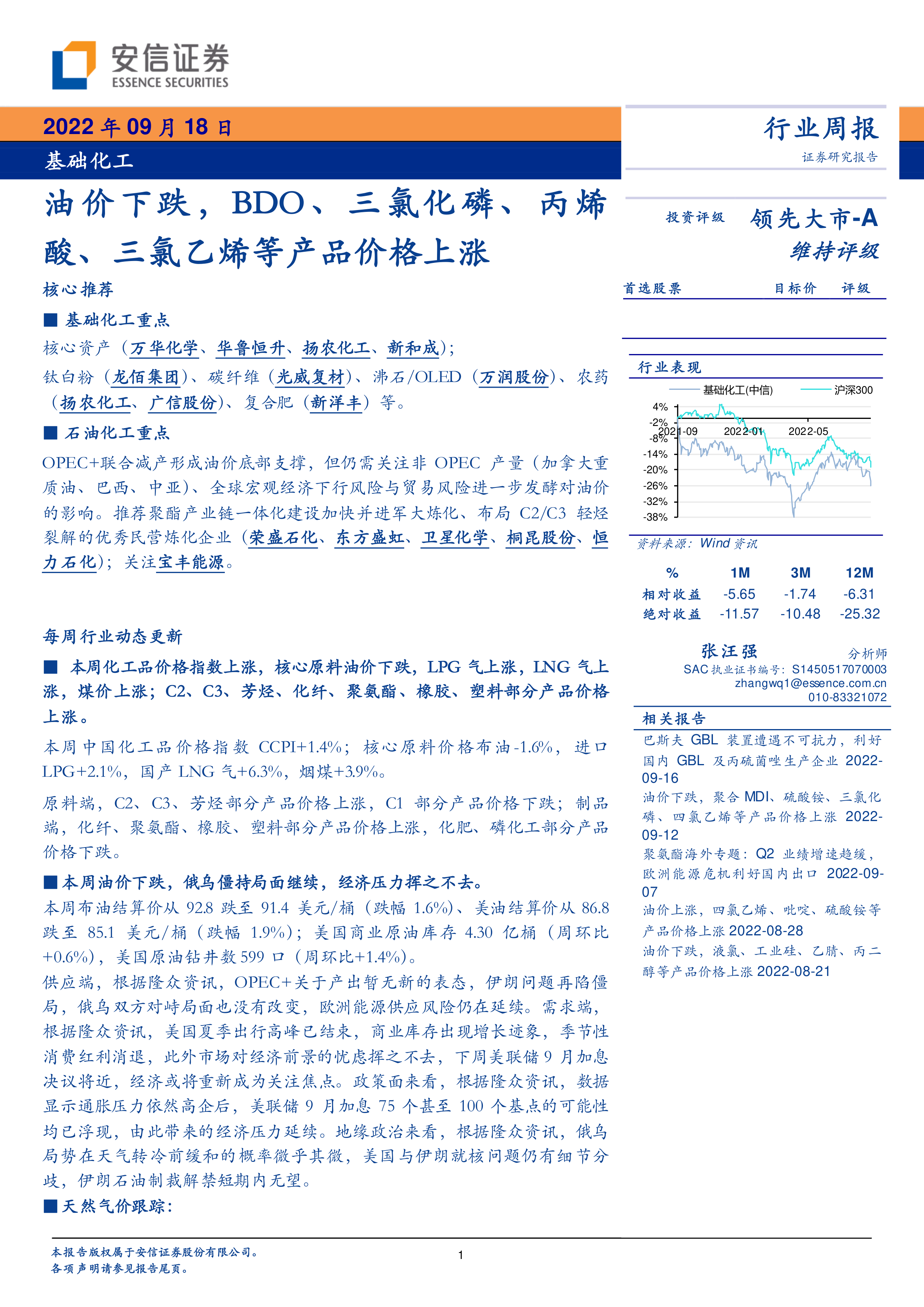 本报告的核心观点是:本周基础化工行业整体表现与大盘同步,部分化工产品价格上涨,主要受原料价格上涨、供应紧张以及下游需求改善等因素驱动;而油价下跌,一定程度上影响了部分化工产品的价格走势。 报告重点关注了BDO、三氯化磷、丙烯酸、三聚氰胺、三氯乙烯等产品的价格波动,并分析了其背后的原因。同时,报告也跟踪了天然气价格及库存变化,并对新能源上游化工品价格进行了分析。