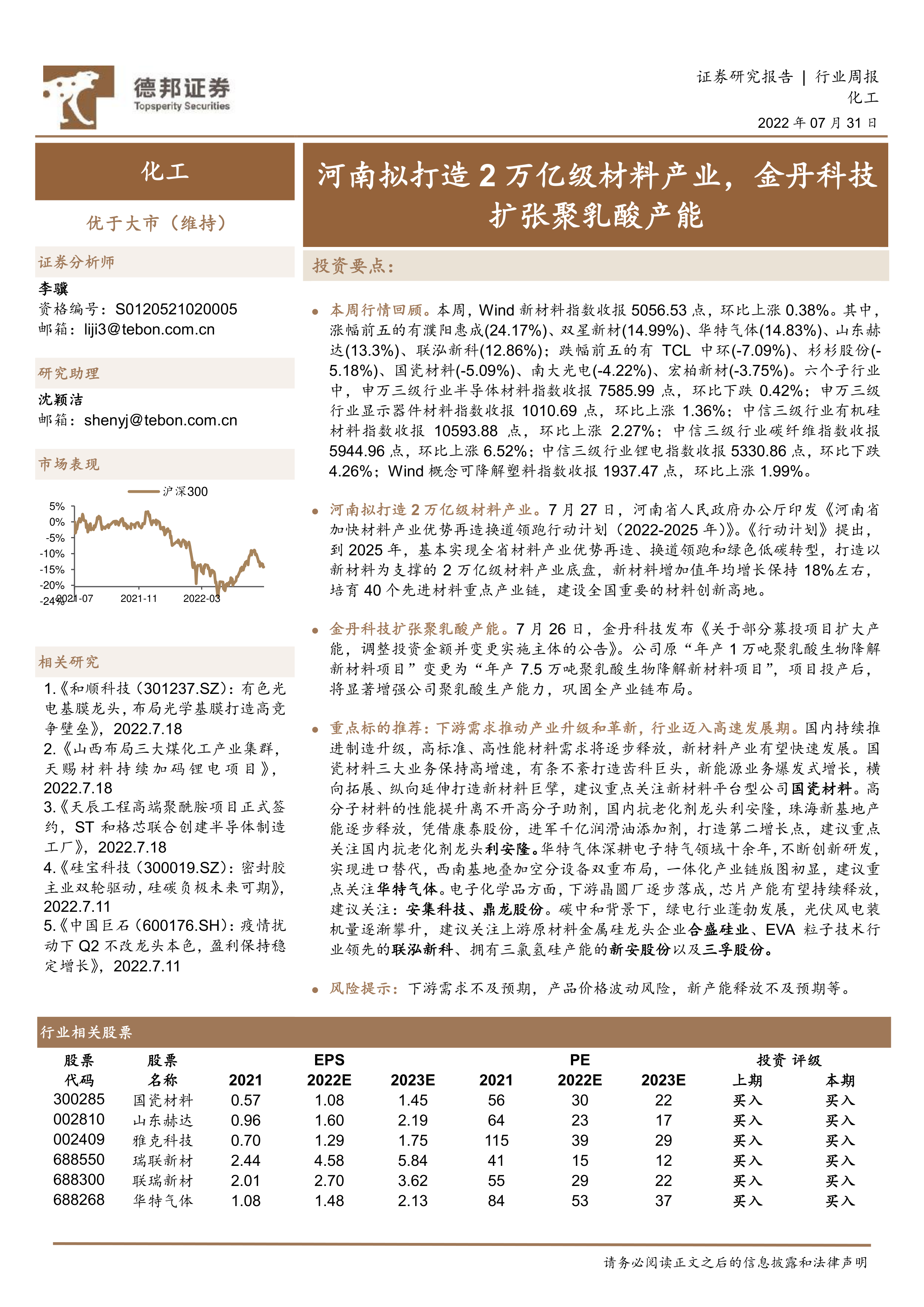 化工行业周报:河南拟打造2万亿级材料产业,金丹科技扩张聚乳酸产能