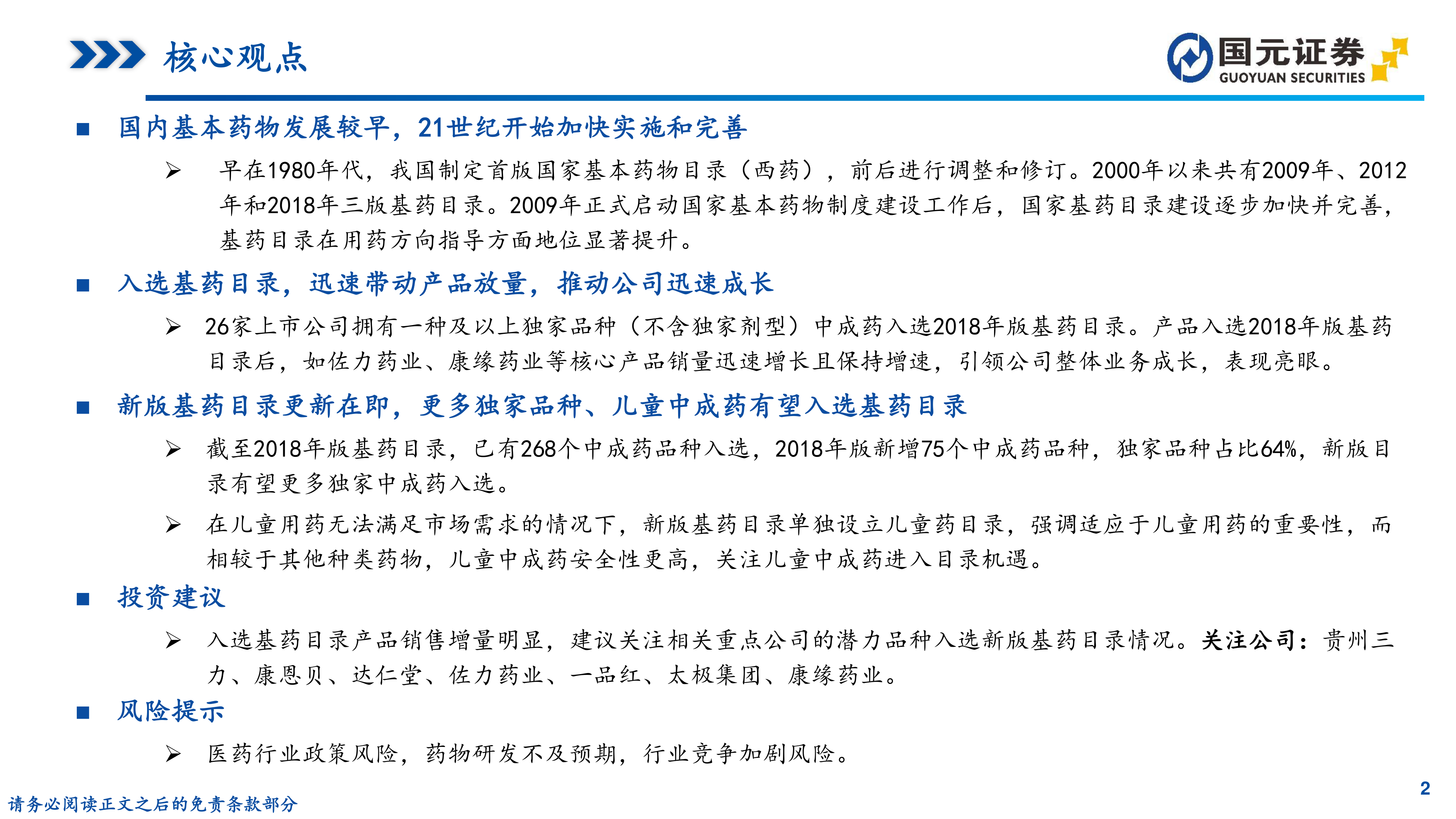 本报告的核心观点是:国家基本药物目录(以下简称“基药目录”)即将更新,这为中药企业,特别是拥有独家品种和儿童中成药的企业,带来了重要的发展机遇。报告通过对基药目录发展历程、2018年版基药目录中中成药情况以及部分重点中药企业的分析,论证了这一观点,并提出了相应的投资建议和风险提示。