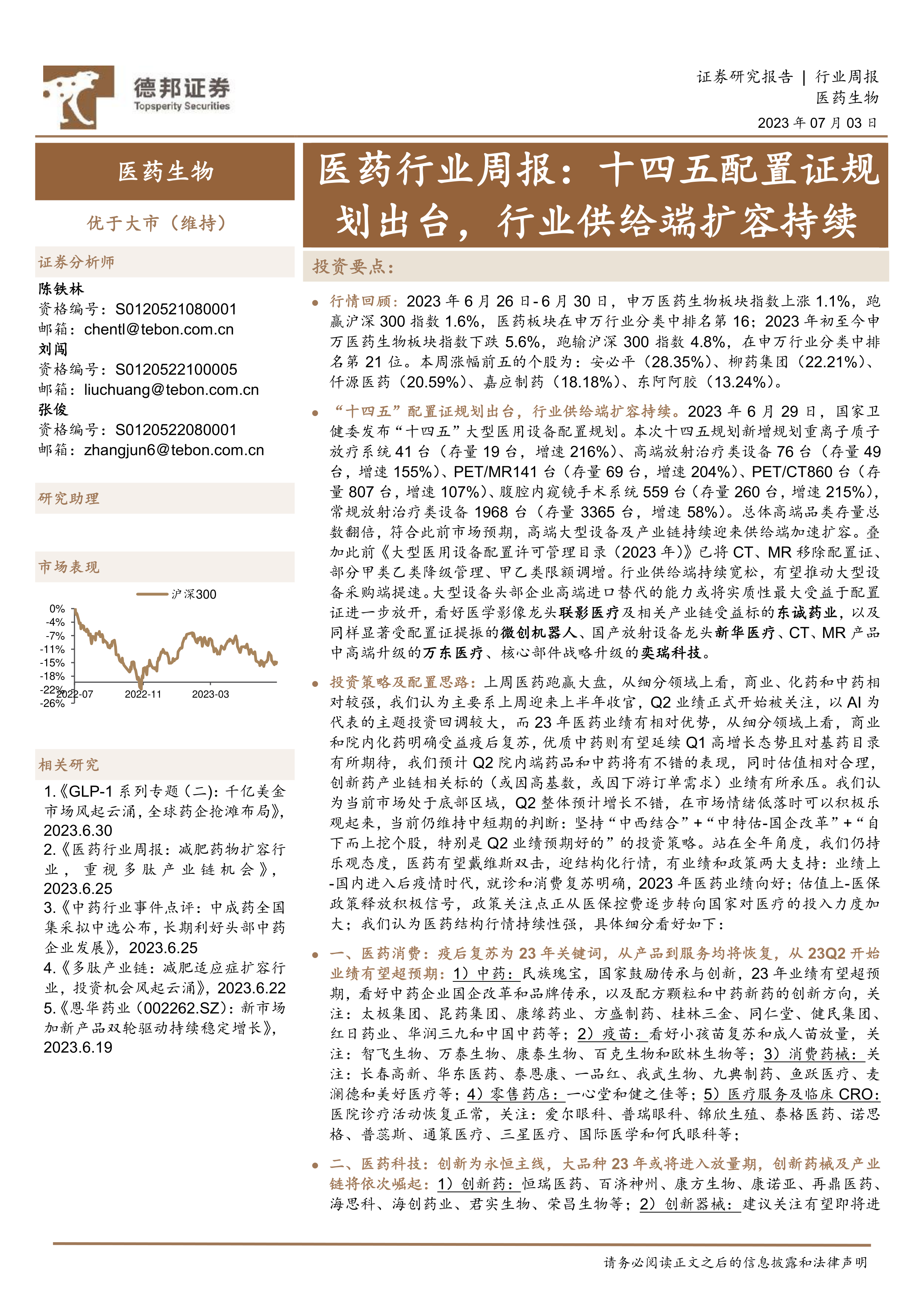 本报告的核心观点是:医药行业在经历了疫情后的调整期后,正展现出积极的复苏态势,并受到国家政策的大力支持。投资策略应围绕“中西结合”、“中特估-国企改革”、“自下而上挖个股(特别是Q2业绩预期好的)”三个关键词展开,看好医药消费、医药科技、医药制造等细分领域,以及中药、疫苗、创新药、医疗器械等具体板块的结构性行情。 “十四五”大型医用设备配置规划的出台,进一步推动了行业供给端扩容,利好高端医疗设备及产业链相关企业。