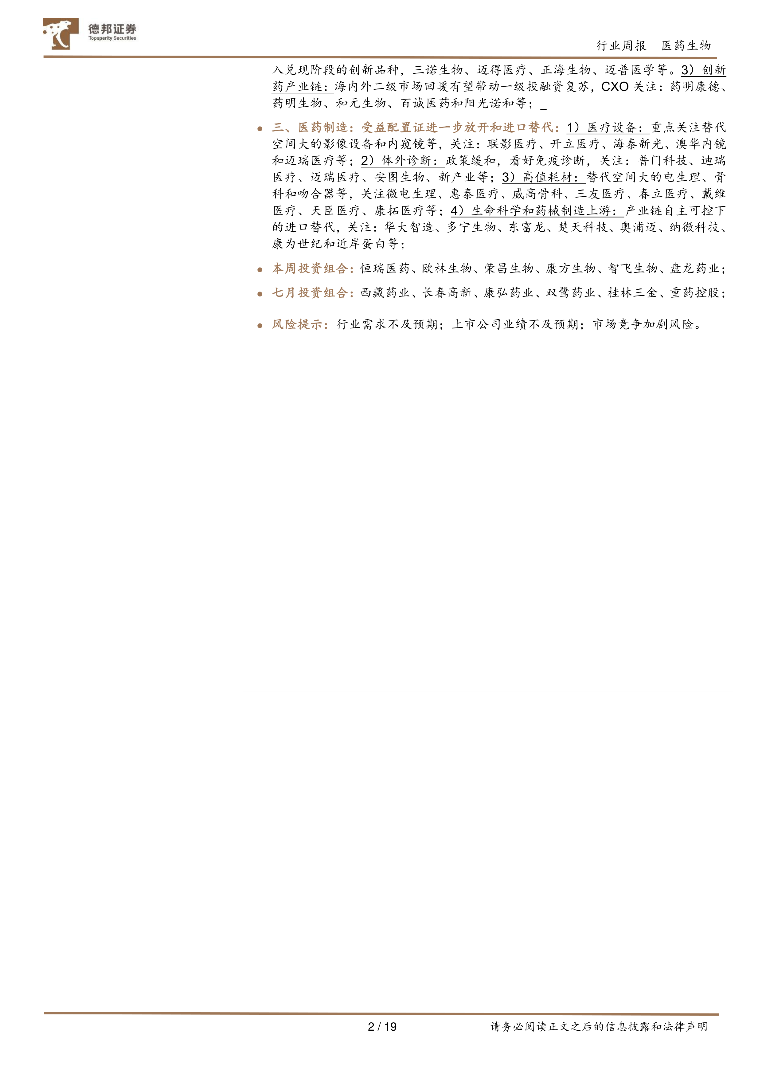 三、医药制造: 受益配置证进一步放开和进口替代: 1)医疗设备: 重点关注替代空间大的影像设备和内窥镜等,关注:联影医疗、开立医疗、海泰新光、澳华内镜和迈瑞医疗等; 2)体外诊断: 政策缓和,看好免疫诊断,关注:普门科技、迪瑞医疗、迈瑞医疗、安图生物、新产业等; 3)高值耗材: 替代空间大的电生理、骨科和吻合器等,关注微电生理、惠泰医疗、威高骨科、三友医疗、春立医疗、戴维医疗、天臣医疗、康拓医疗等; 4)生命科学和药械制造上游: 产业链自主可控下的进口替代,关注:华大智造、多宁生物、东富龙、楚天科技、奥浦迈、纳微科技、康为世纪和近岸蛋白等;