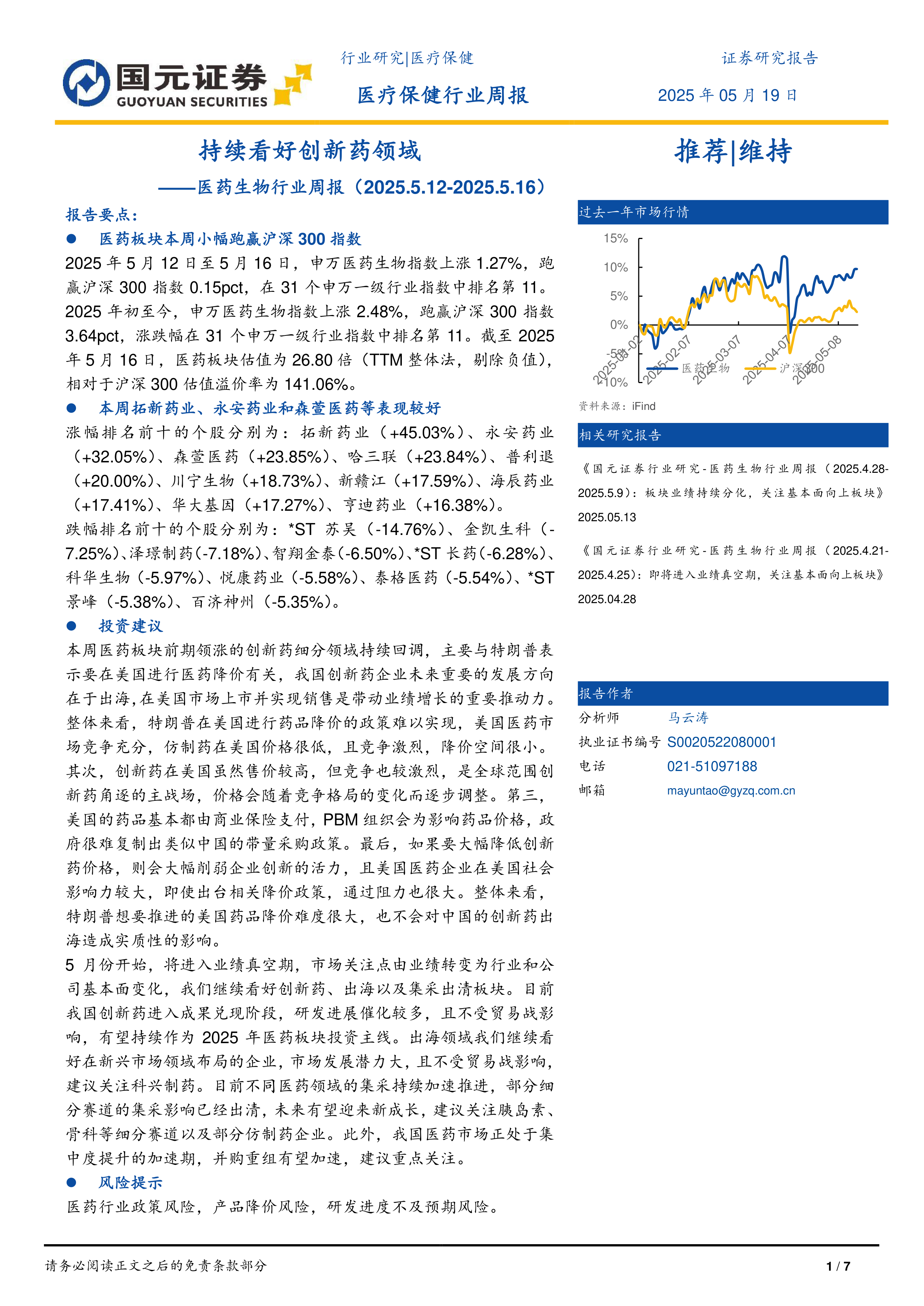 5月份开始,将进入业绩真空期,市场关注点由业绩转变为行业和公司基本面变化,我们继续看好创新药、出海以及集采出清板块。目前我国创新药进入成果兑现阶段,研发进展催化较多,且不受贸易战影响,有望持续作为2025年医药板块投资主线。出海领域我们继续看好在新兴市场领域布局的企业,市场发展潜力大,且不受贸易战影响,建议关注科兴制药。目前不同医药领域的集采持续加速推进,部分细分赛道的集采影响已经出清,未来有望迎来新成长,建议关注胰岛素、骨科等细分赛道以及部分仿制药企业。此外,我国医药市场正处于集中度提升的加速期,并购重组有望加速,建议重点关注。