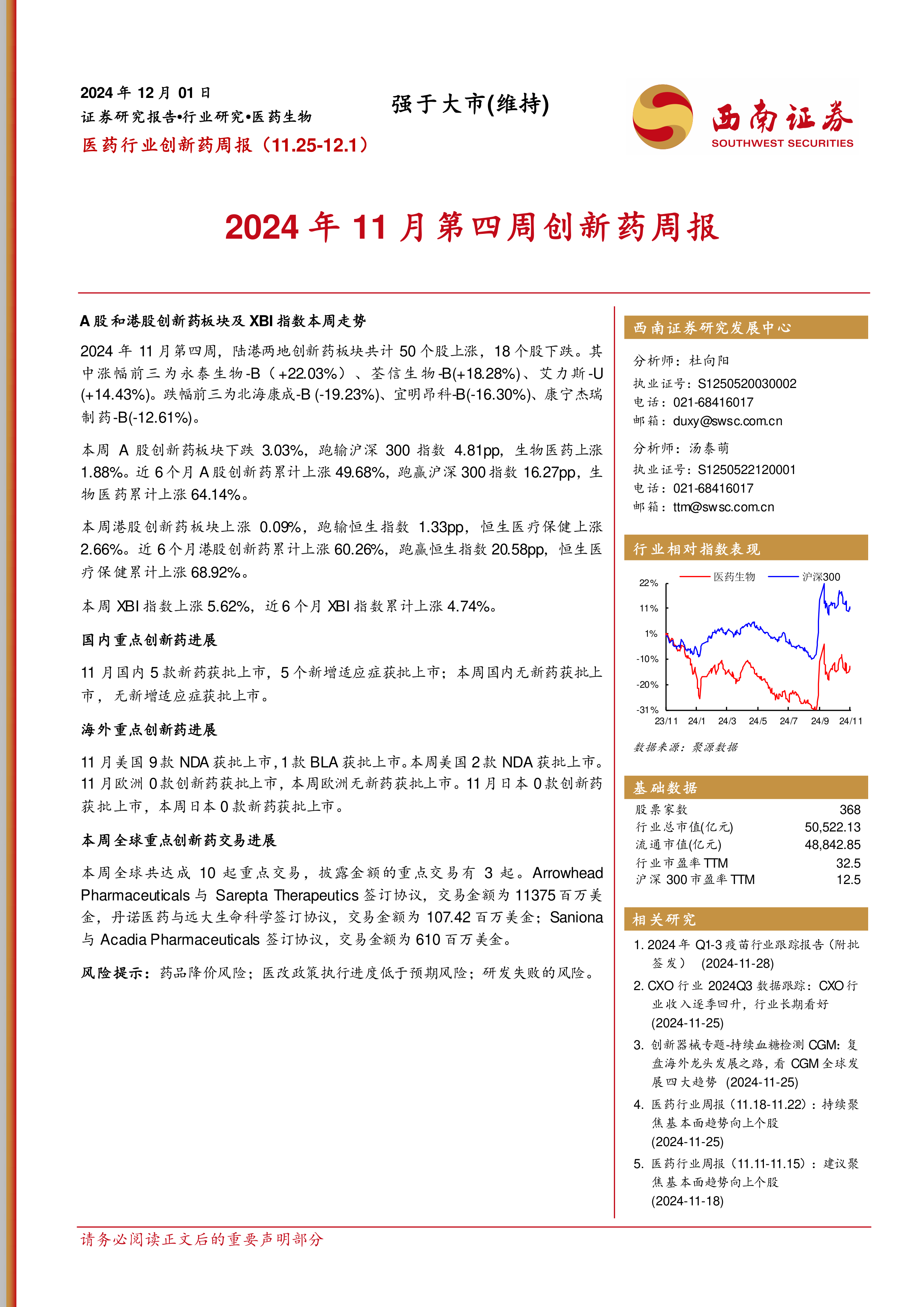 本报告首先分析了2024年11月第四周A股、港股创新药板块以及美股XBI指数的周度表现和近6个月的累计表现。数据显示,A股创新药板块本周跑输大盘,但近6个月累计涨幅显著;港股创新药板块本周表现与大盘持平,但近6个月累计涨幅也高于大盘;XBI指数则持续保持强劲增长态势。 报告还列出了陆港两地创新药板块涨跌幅前三的个股,为投资者提供参考。
