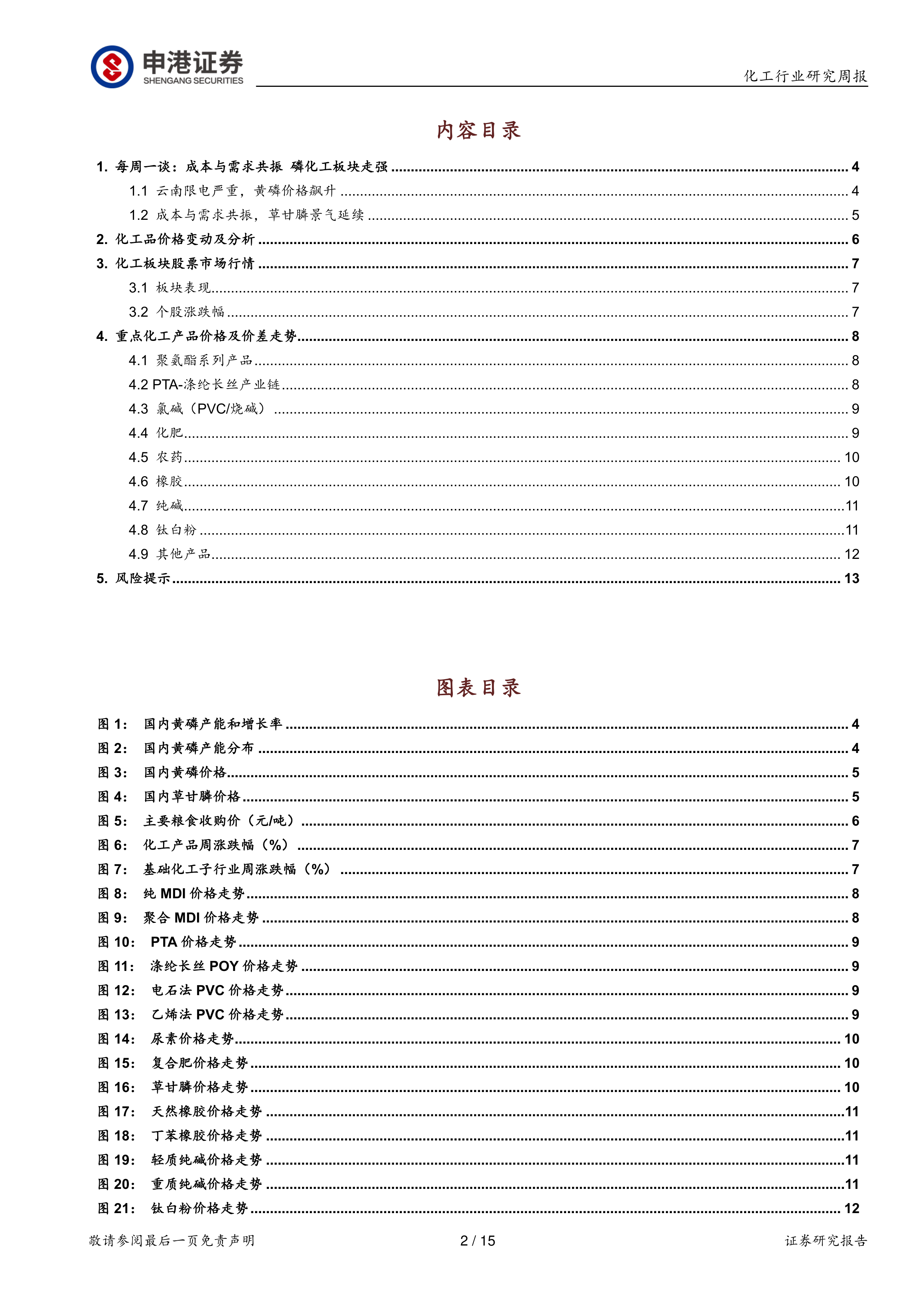 本节对本周化工品价格变动进行了总结,列举了涨幅靠前和跌幅靠前的品种,并对部分品种的价格走势进行了简要分析。涨幅靠前的品种主要包括黄磷、磷酸、液氯、氧气、草甘膦等;跌幅靠前的品种主要包括三聚氰胺、异丁醛、双酚A、兰炭等。