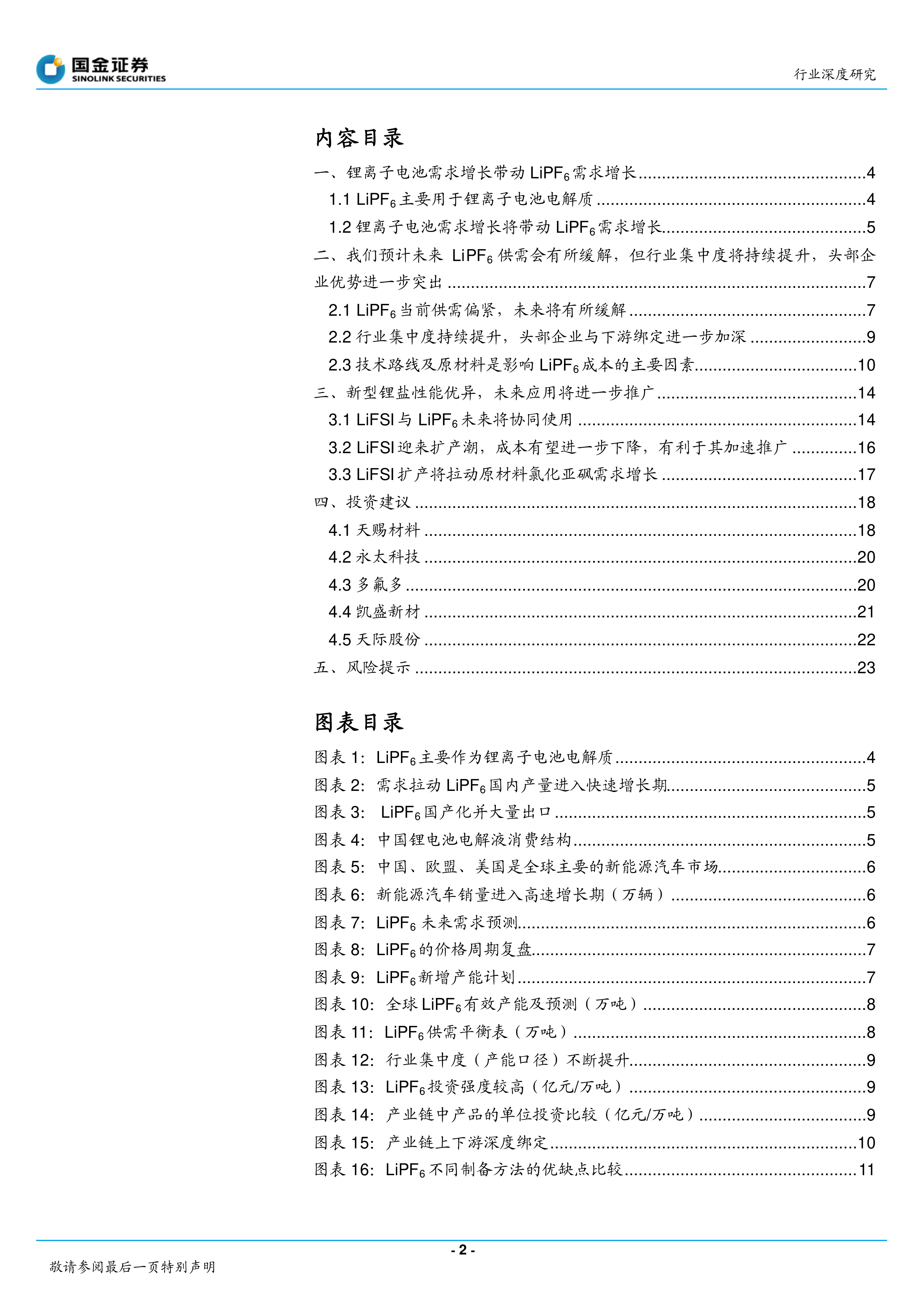 本报告的核心观点是:六氟磷酸锂(LiPF₆)市场景气向上,但未来供需紧张局面将缓解;行业集中度将持续提升,头部企业优势进一步突出;新型锂盐LiFSI的推广将推动行业发展。 建议关注竞争优势突出的头部企业,例如天赐材料、永太科技、多氟多、凯盛新材和天际股份。 同时,报告也指出了产能过剩、新能源汽车需求不及预期、原材料价格大幅上涨以及新型电池替代等风险。