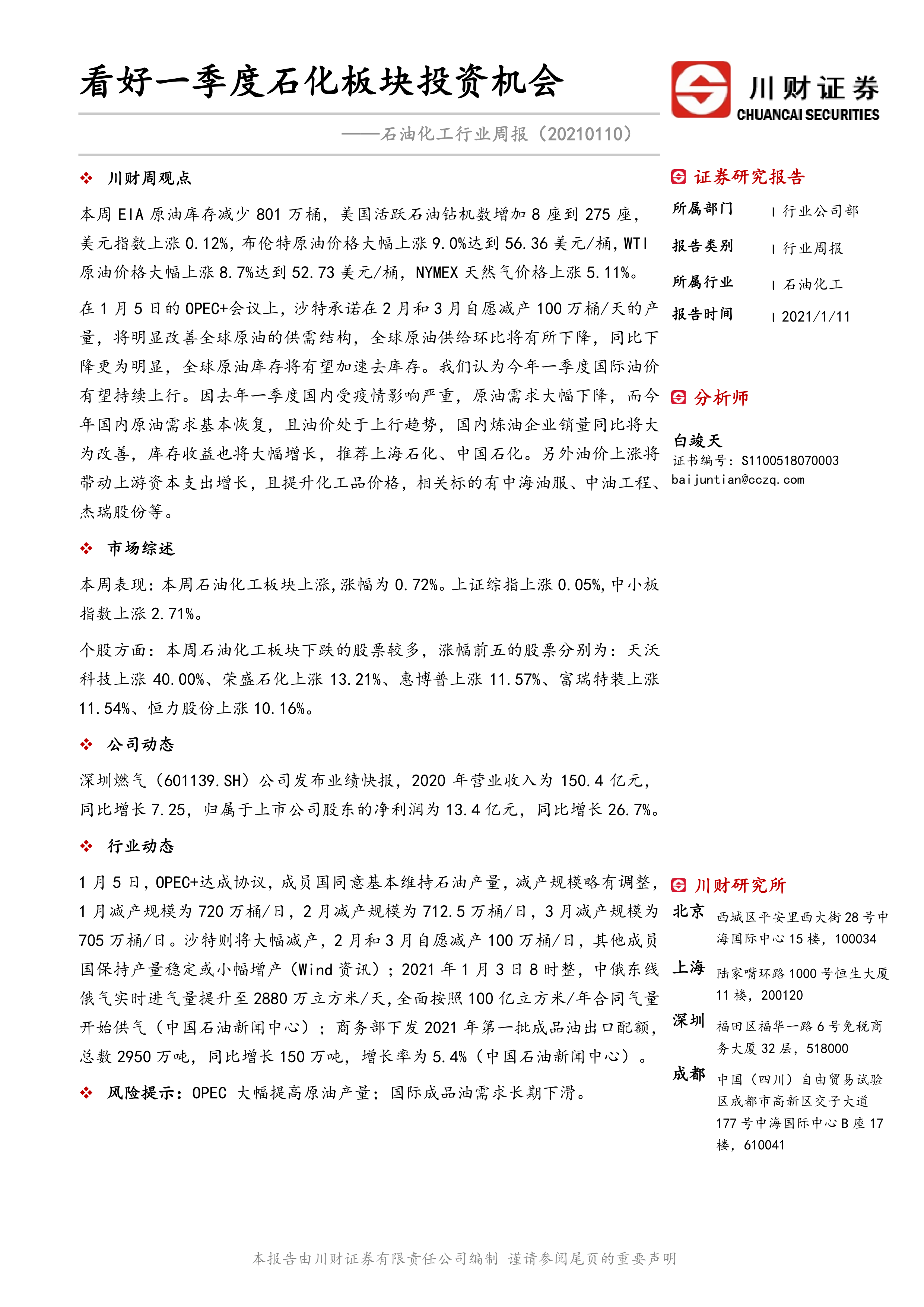 本报告基于OPEC+减产协议带来的国际油价上涨预期,以及国内原油需求的恢复,看好2021年一季度石化板块的投资机会。报告分析了本周石油化工板块的市场表现、原油价格及库存变化、石化产品价格波动以及重要的行业和公司动态。 建议投资者关注相关公司,例如上海石化、中国石化、中海油服、中油工程、杰瑞股份等,但需注意OPEC大幅提高原油产量和国际成品油需求长期下滑等潜在风险。 投资者应结合自身风险承受能力和投资目标,谨慎决策。