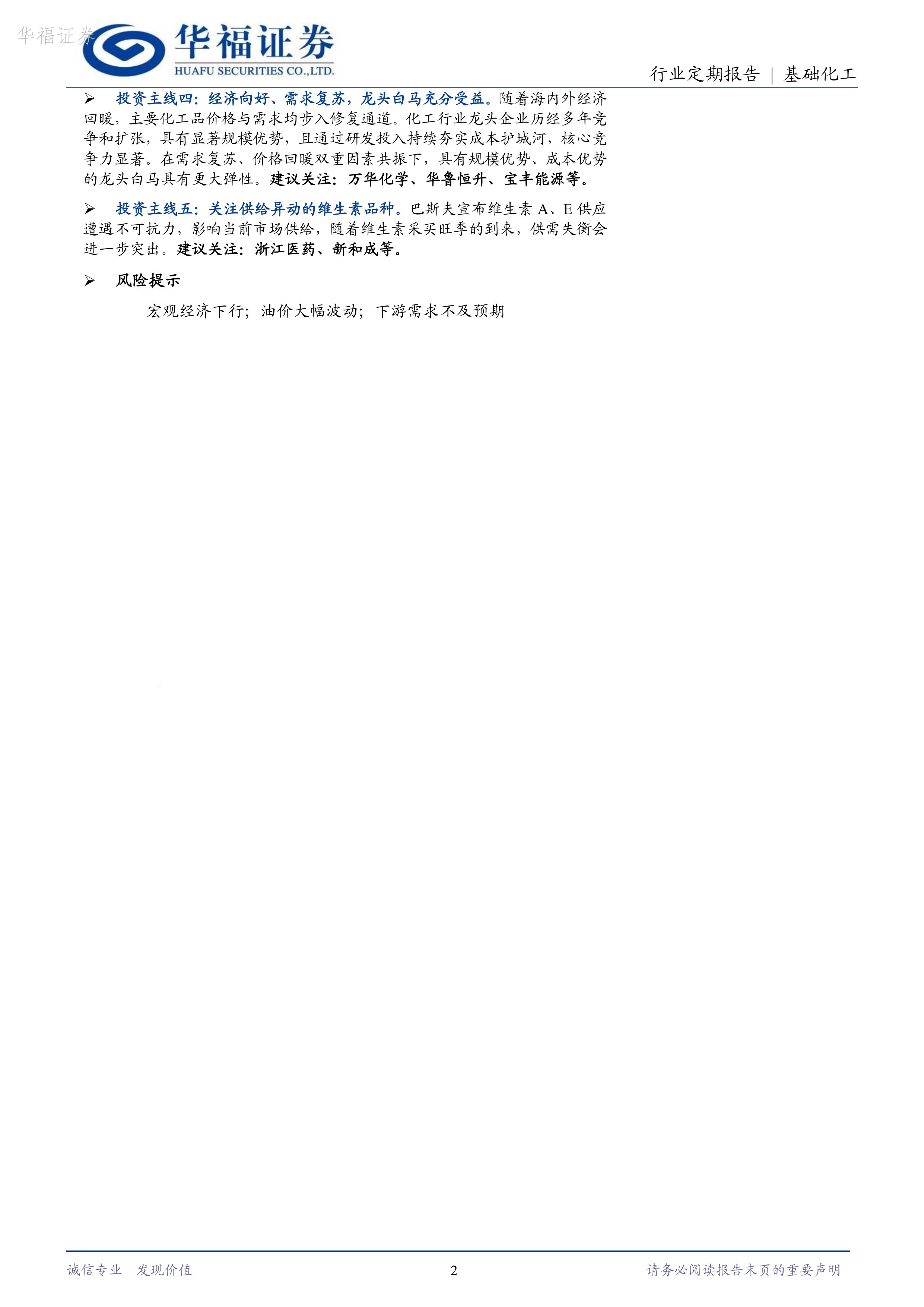 投资主线四:经济向好、需求复苏,龙头白马充分受益。随着海内外经济回暖,主要化工品价格与需求均步入修复通道。化工行业龙头企业历经多年竞争和扩张,具有显著规模优势,且通过研发投入持续夯实成本护城河,核心竞争力显著。在需求复苏、价格回暖双重因素共振下,具有规模优势、成本优势的龙头白马具有更大弹性。建议关注:万华化学、华鲁恒升、宝丰能源等。