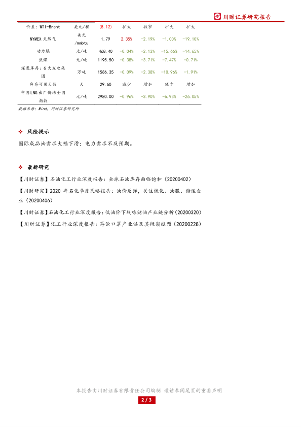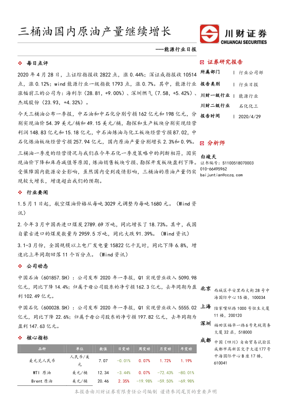 本报告基于川财证券研究所的数据和分析,对2020年一季度中国能源行业,特别是三桶油的经营状况进行了深入分析。报告指出,尽管面临国际油价暴跌和疫情冲击,三桶油的国内原油产量仍实现了增长,但炼油销售板块的巨额亏损导致整体盈利能力大幅下降。报告强调了保障国家能源安全的重要性,并提示了国际成品油需求下滑和电力需求不及预期的潜在风险。 报告中提供的各项数据和分析,为投资者理解当时能源市场形势和三桶油的经营状况提供了重要的参考依据。 然而,报告也应注意到其分析基于当时的数据和市场环境,未来市场走势可能存在变化。