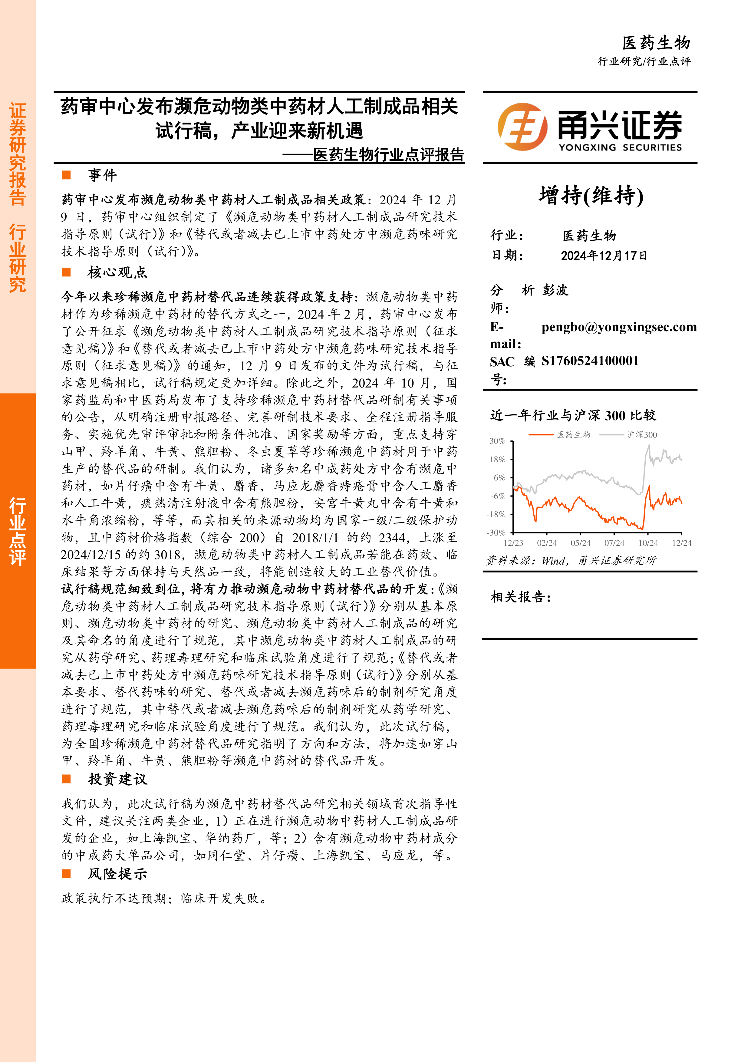 今年以来珍稀濒危中药材替代品连续获得政策支持:濒危动物类中药材作为珍稀濒危中药材的替代方式之一,2024年2月,药审中心发布了公开征求《濒危动物类中药材人工制成品研究技术指导原则(征求意见稿)》和《替代或者减去已上市中药处方中濒危药味研究技术指导原则(征求意见稿)》的通知,12月9日发布的文件为试行稿,与征求意见稿相比,试行稿规定更加详细。除此之外,2024年10月,国家药监局和中医药局发布了支持珍稀濒危中药材替代品研制有关事项的公告,从明确注册申报路径、完善研制技术要求、全程注册指导服务、实施优先审评审批和附条件批准、国家奖励等方面,重点支持穿山甲、羚羊角、牛黄、熊胆粉、冬虫夏草等珍稀濒危中药材用于中药生产的替代品的研制。我们认为,诸多知名中成药处方中含有濒危中药材,如片仔癀中含有牛黄、麝香,马应龙麝香痔疮膏中含人工麝香和人工牛黄,痰热清注射液中含有熊胆粉,安宫牛黄丸中含有牛黄和水牛角浓缩粉,等等,而其相关的来源动物均为国家一级/二级保护动物,且中药材价格指数(综合200)自2018/1/1的约2344,上涨至2024/12/15的约3018,濒危动物类中药材人工制成品若能在药效、临床结果等方面保持与天然品一致,将能创造较大的工业替代价值。