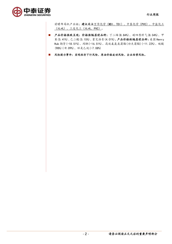 重点推荐:远兴能源:天然碱法龙头。截至2021年年末,公司拥有180万吨/年纯碱、110万吨/年小苏打和154万吨/年尿素设计产能,子公司银根矿业(控股60%)一期纯碱500万吨/年、小苏打40万吨/年,计划于2023年6月建设完成。基于塔木素低成本煤炭、高品位矿石等优势,天然碱龙头延续低成本优势实现高成长。龙佰集团:钛白粉龙头,拥有121万吨产能,云南20万吨氯化法钛白粉项目二期预计年底年底投产,产能将达131万吨。公司公告称,各型号钛白粉价格上调800元/吨,海绵钛产品调2,000元/吨,产品价格迎来底部反转,此外公司持续延伸产业链,2023年将投产3万吨海绵钛、700万吨高效选矿项目预计于2024年投产,进一步巩固龙头地位。新能源方面,2022年10月,公司5万吨磷酸铁、5万吨磷酸铁锂均已实现达标达产,预计2023年将形成磷酸铁35万吨、磷酸铁锂35万吨、石墨负极30万吨产能。此外,公司建设钒钛铁精矿碱性球团湿法工艺,年产3万吨五氧化二钒项目,一期1.5万吨预计2023年底建成投产,二期1.5万吨预计2024年底投产,前瞻布局钒产业链;建议关注万华化学(MDI、TDI)、中泰化学(PVC)、中盐化工(纯碱)、三友化工(纯碱、PVC)。