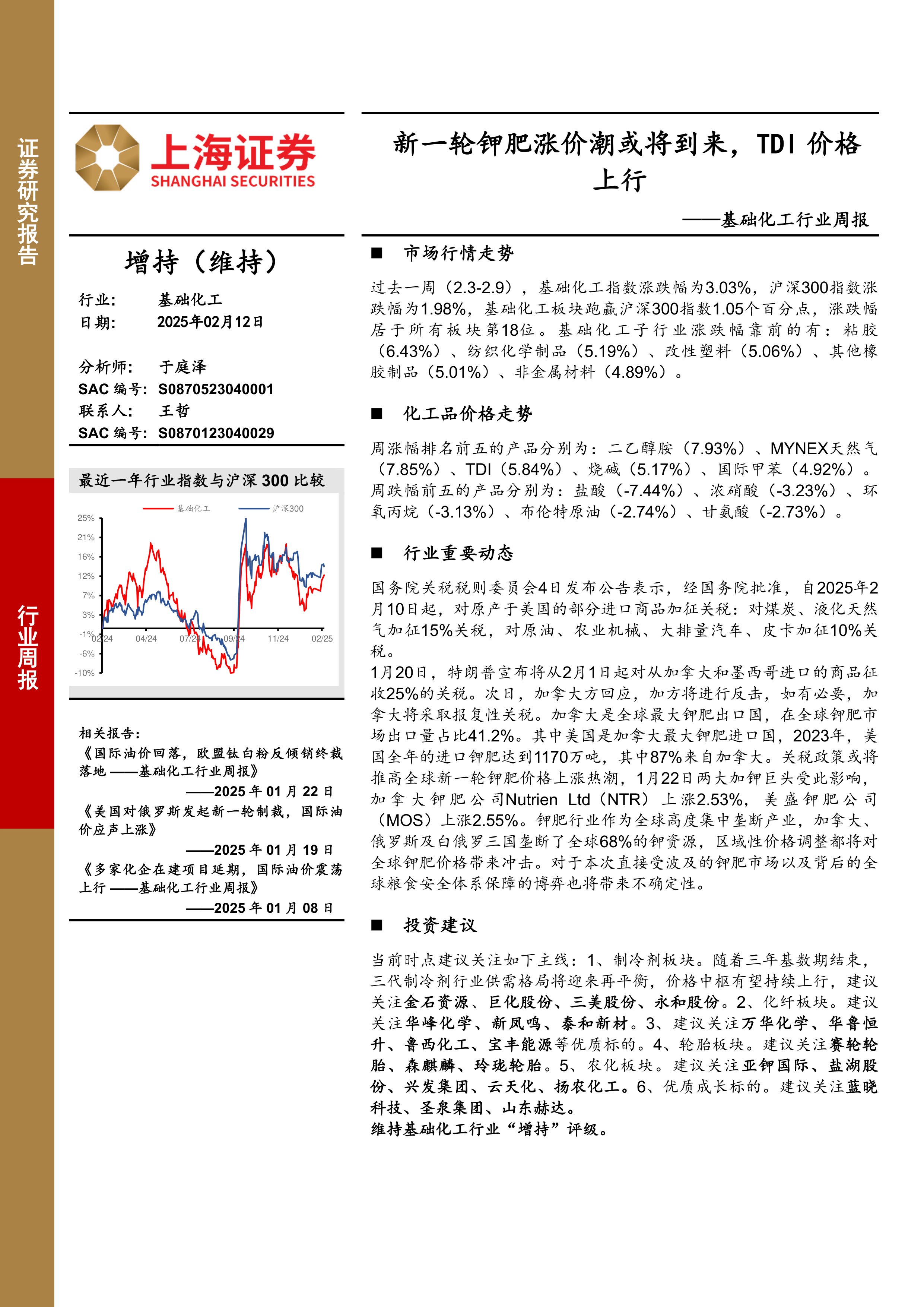 本报告基于对基础化工行业近期市场行情的分析,特别是对钾肥市场潜在价格上涨的预测,给出了相应的投资建议。报告数据显示基础化工行业整体表现良好,但个股及产品价格波动较大,投资者需谨慎评估风险。 美国对加拿大和墨西哥加征关税的政策是影响钾肥价格上涨的关键因素,其潜在影响和不确定性值得持续关注。 报告最后列出了潜在的投资机会和风险提示,为投资者提供参考,但投资者仍需进行独立的判断和分析。