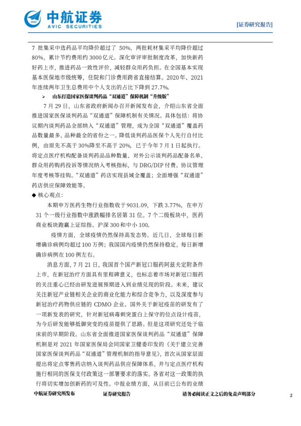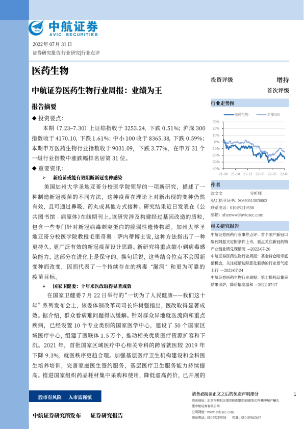 消息方面,7月21日,我国首个国产新冠口服药阿兹夫定附条件上市,在新冠治疗方面具有里程碑意义,也标志着市场对新冠口服药的关注重心已经由研发进展预期进入到业绩兑现的阶段。未来,建议关注新冠产业链相关企业的商业化能力和综合竞争力,以及深度参与新冠治疗药物供应链的CDMO企业。国外关于新冠疫苗的研发有了项新发表的研究,针对新冠病毒刺突蛋白上保守的位点设计疫苗,为今后研发能够抵御突变的疫苗提供了思路。但是这项研究还处于临床前的早期阶段。山东省全面推进国家医保谈判药品“双通道”保障机制是对2021年国家医保局会同国家卫健委印发的《关于建立完善国家医保谈判药品“双通道”管理机制的指导意见》,首次从国家层面提出将定点零售药店纳入谈判药品供应保障体系,并与定点医疗机构施行相同的医保支付政策这一部署要求的落实。各省对这一政策的执行将切实增加创新药的可及性。中报业绩方面,从目前已公布的业绩预告情况来看,医药生物行业大多上市公司在2022H呈现业绩环比和同比上涨的态势,我们认为一定程度上表现出了行业在二季度业绩将会呈现边际改善的态势,基于此,我们对行业2022H业绩表现保持较为乐观的态度。