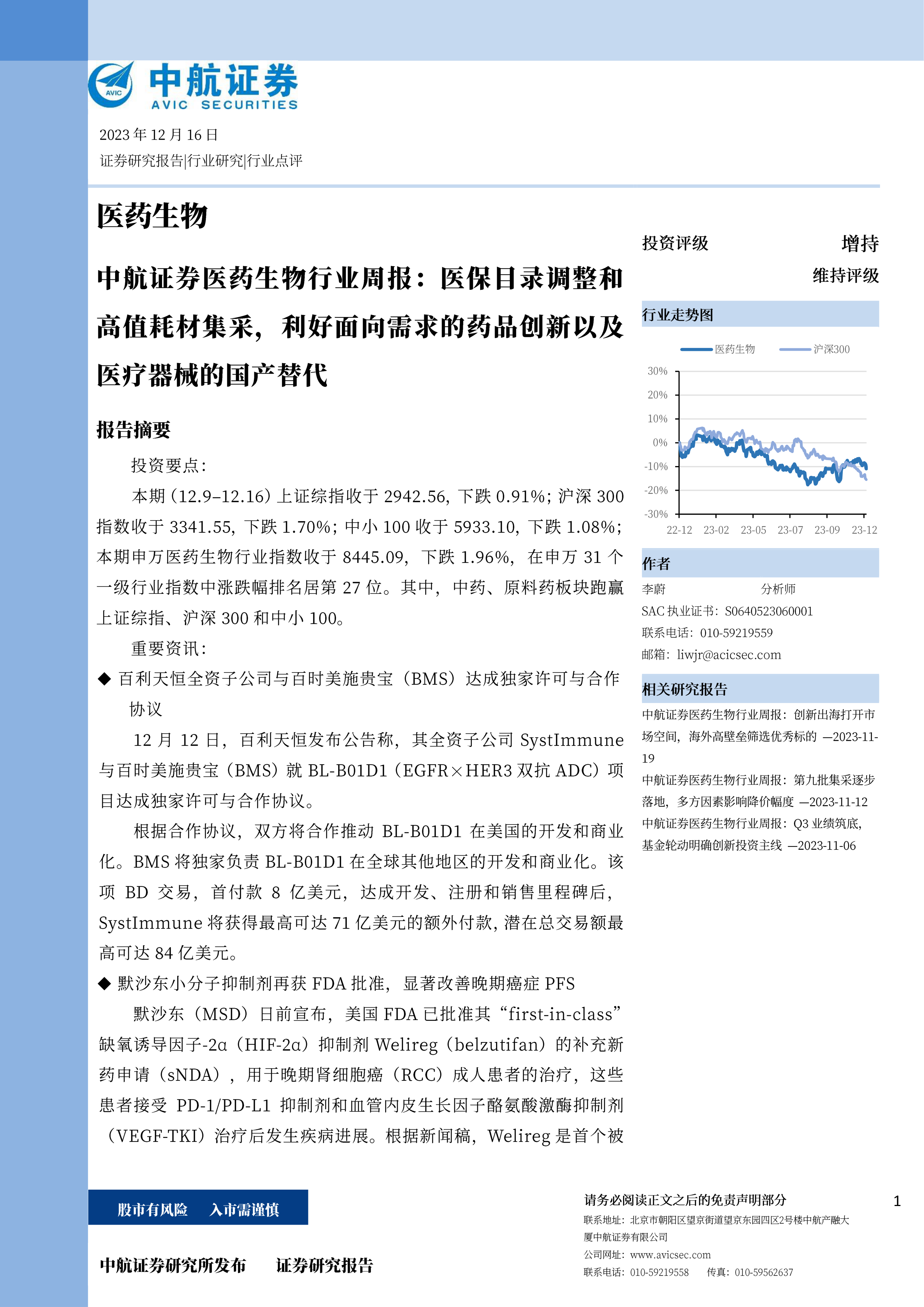 本期(12.9–12.16)上证综指收于2942.56,下跌0.91%;沪深300指数收于3341.55,下跌1.70%;中小100收于5933.10,下跌1.08%;本期申万医药生物行业指数收于8445.09,下跌1.96%,在申万31个一级行业指数中涨跌幅排名居第27位。其中,中药、原料药板块跑赢上证综指、沪深300和中小100。