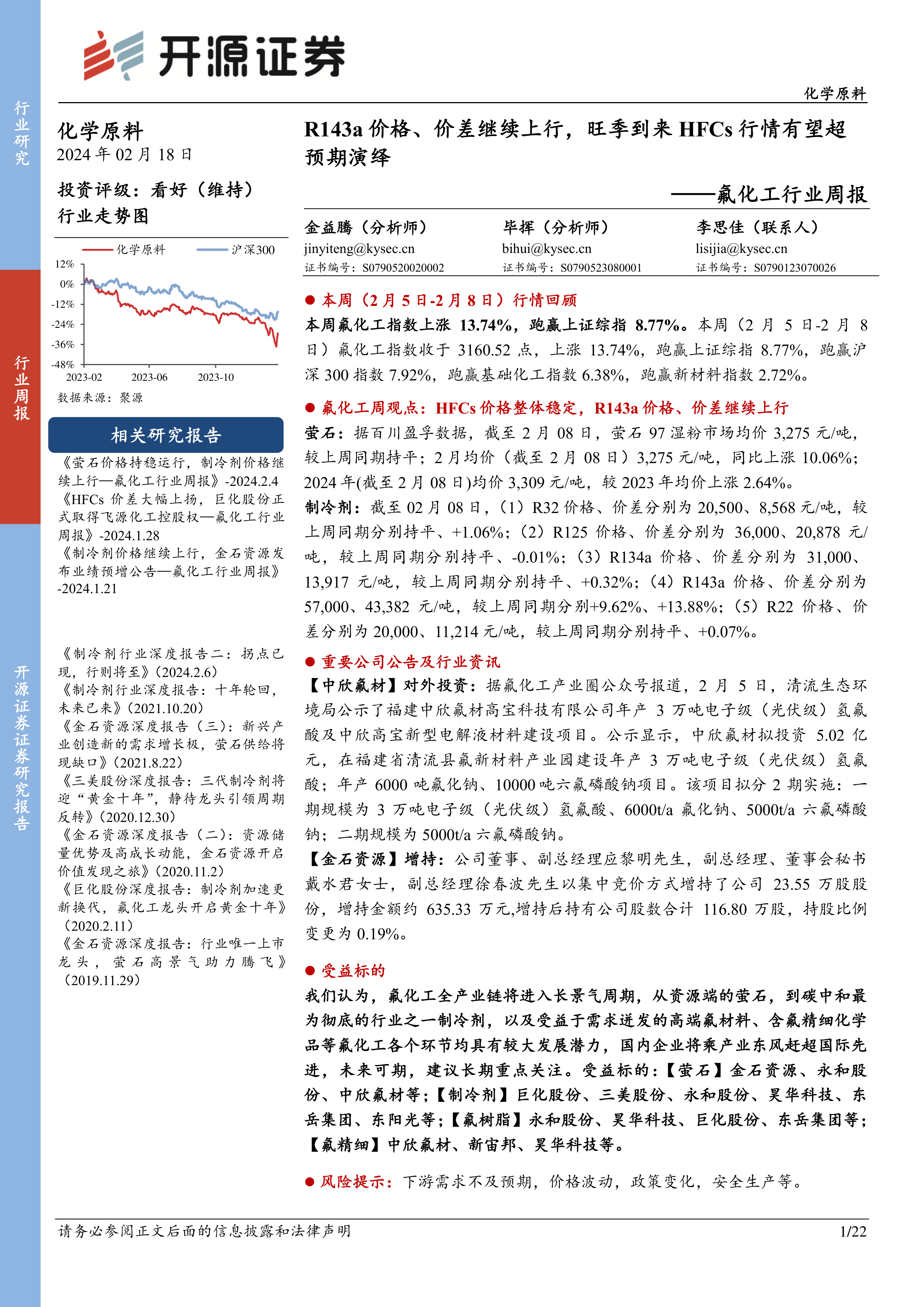 氟化工行业周报:R143a价格、价差继续上行,旺季到来HFCs行情有望超预期演绎