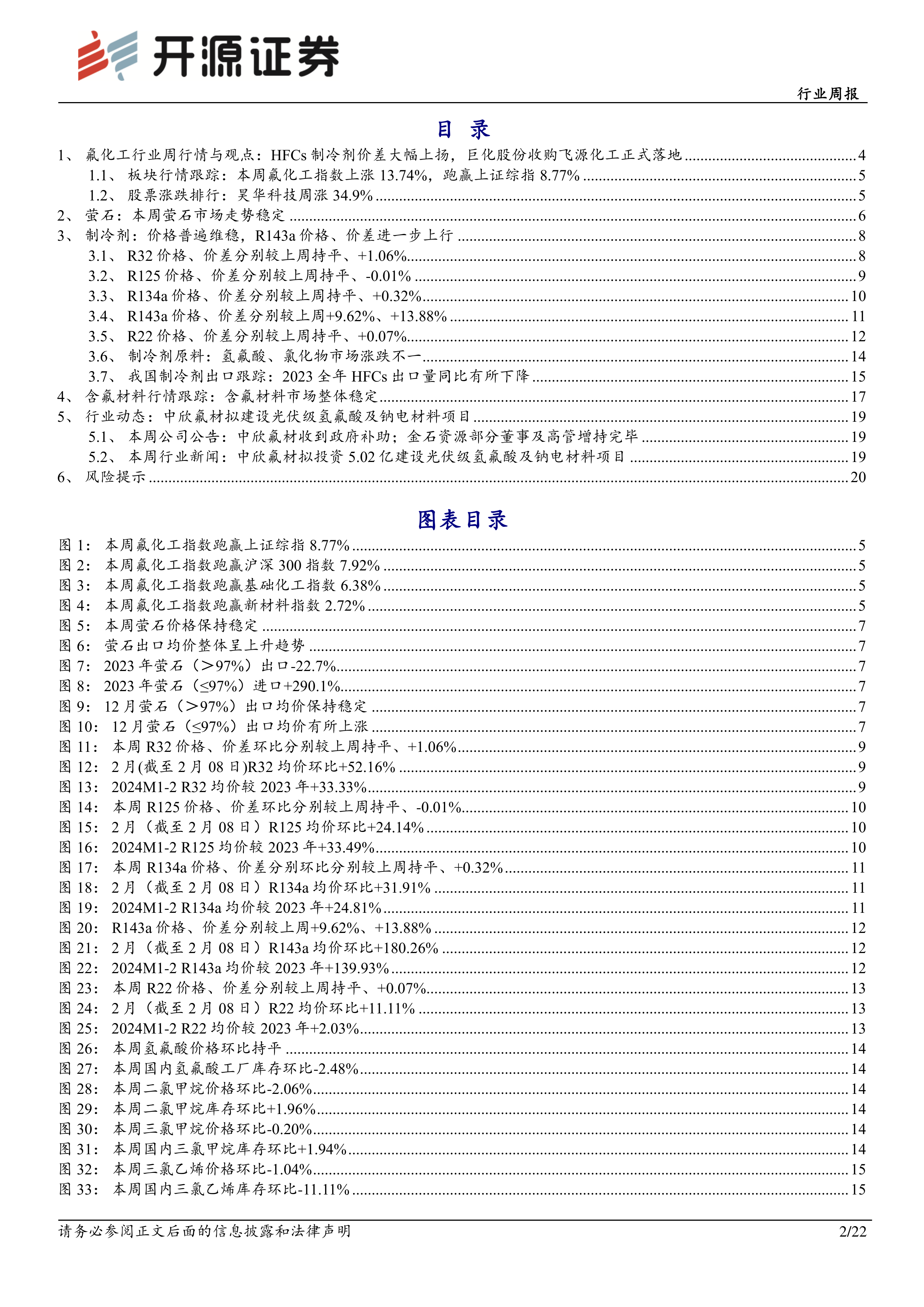 氟化工周观点:HFCs价格整体稳定,R143a价格、价差继续上行