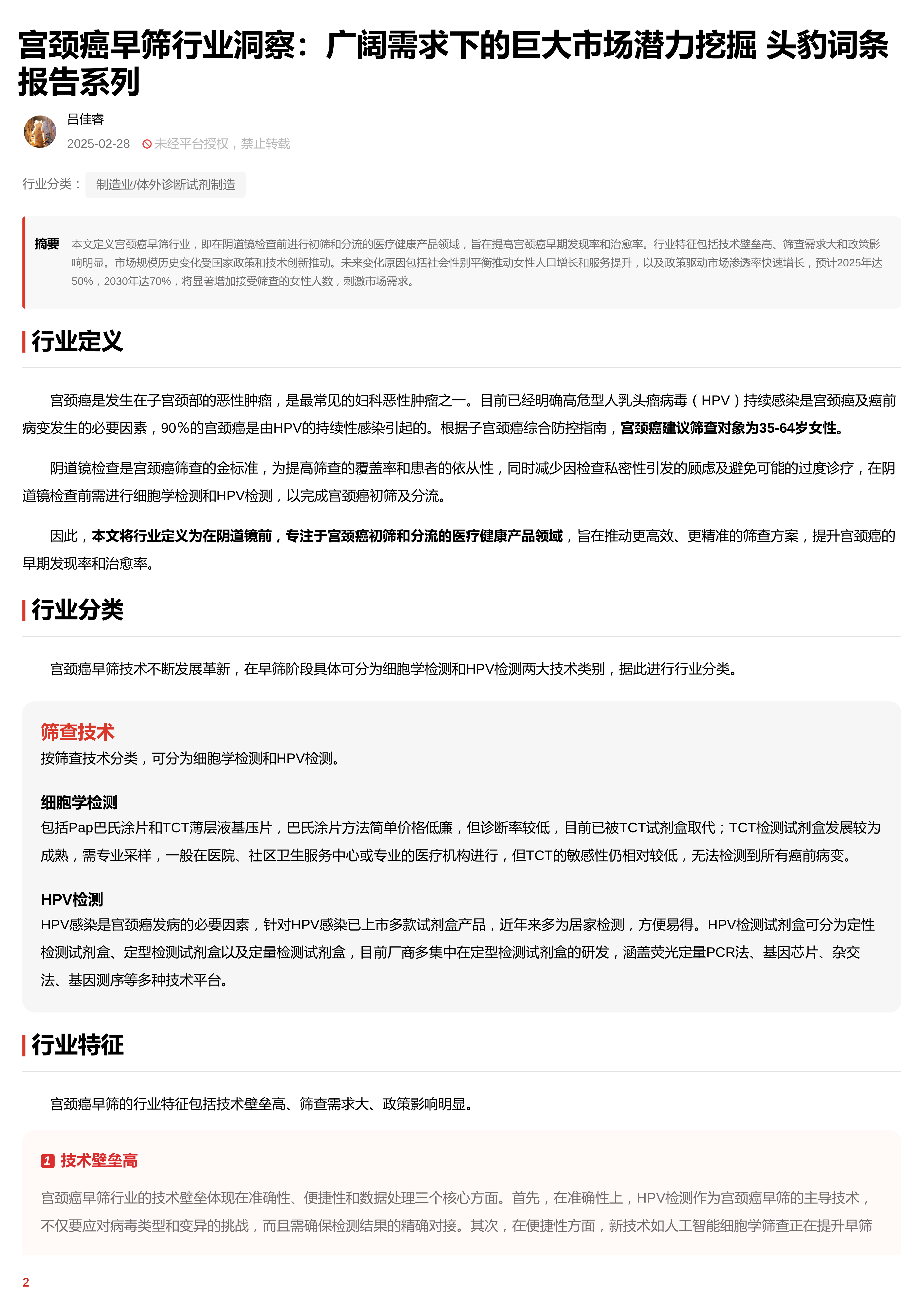 本报告从行业定义、分类、特征、发展历程、产业链分析、行业规模、竞争格局以及上市公司分析等多个维度对宫颈癌早筛行业进行了深入分析。