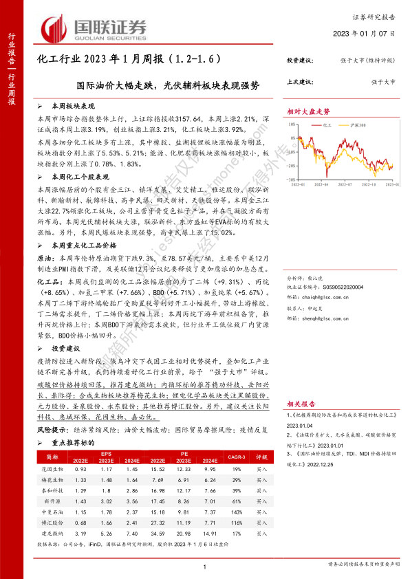本报告对2023年1月2日至1月6日期间化工行业市场表现进行了全面分析。 在国际油价下跌、疫情防控政策调整以及俄乌冲突持续的背景下,化工行业整体表现强劲,但市场风险依然存在。 报告维持对化工行业的“强于大市”评级,并提出了多项具体的投资建议,为投资者提供了参考。 然而,投资者仍需谨慎评估自身风险承受能力,并结合自身投资目标进行独立判断。