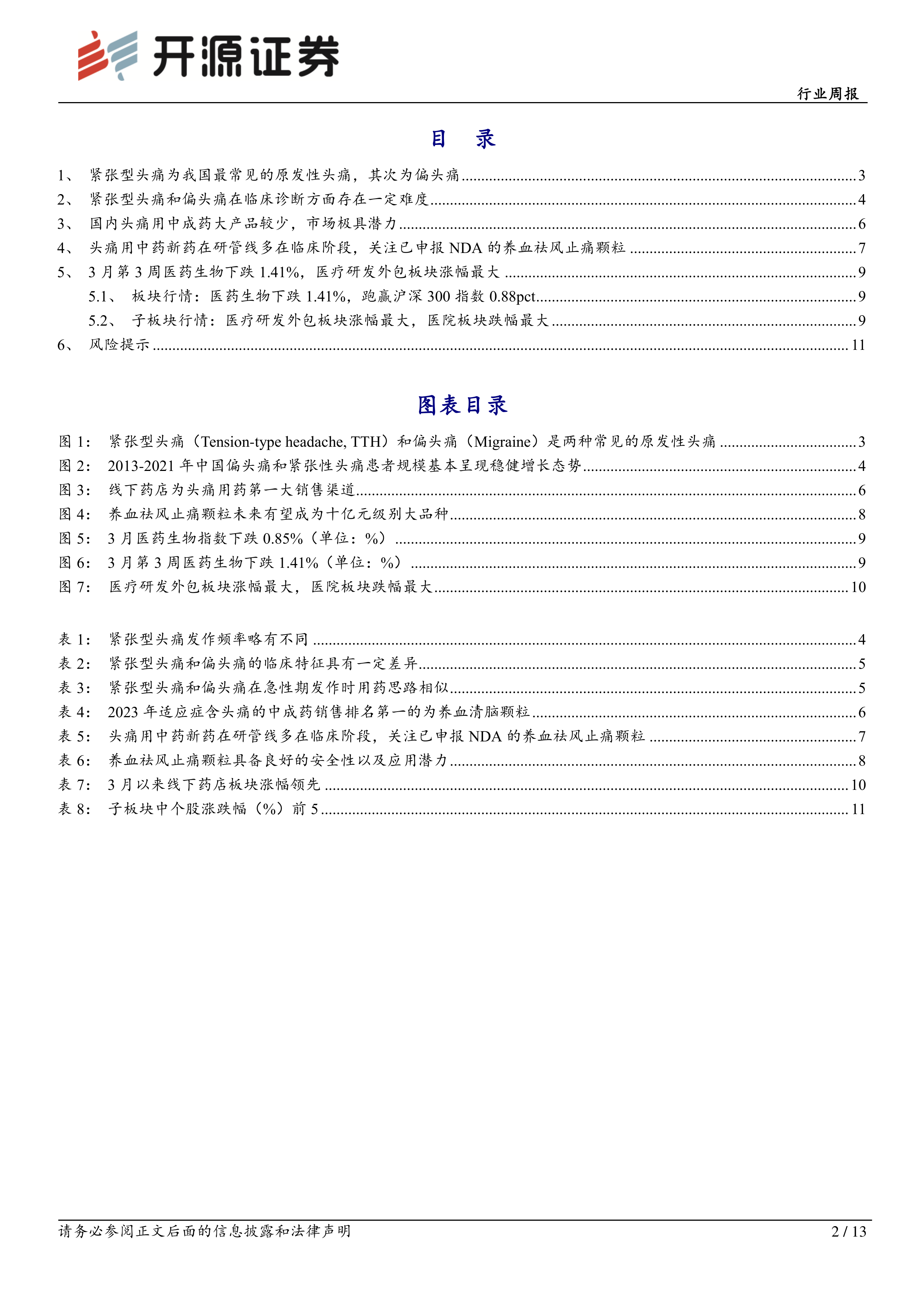 本报告的核心观点是:原发性头痛(特别是紧张型头痛)的中成药市场存在巨大开发潜力。目前市场上缺乏针对原发性头痛,特别是紧张型头痛的有效中成药新药,而现有产品销售额突破2亿元的仅有少数几款,且并非专门针对原发性头痛。 方盛制药的养血祛风止痛颗粒NDA申请已获受理,其上市有望填补市场空白,并成为十亿元级别的大品种。 此外,报告还分析了头痛市场规模、竞争格局以及医药生物行业整体走势。