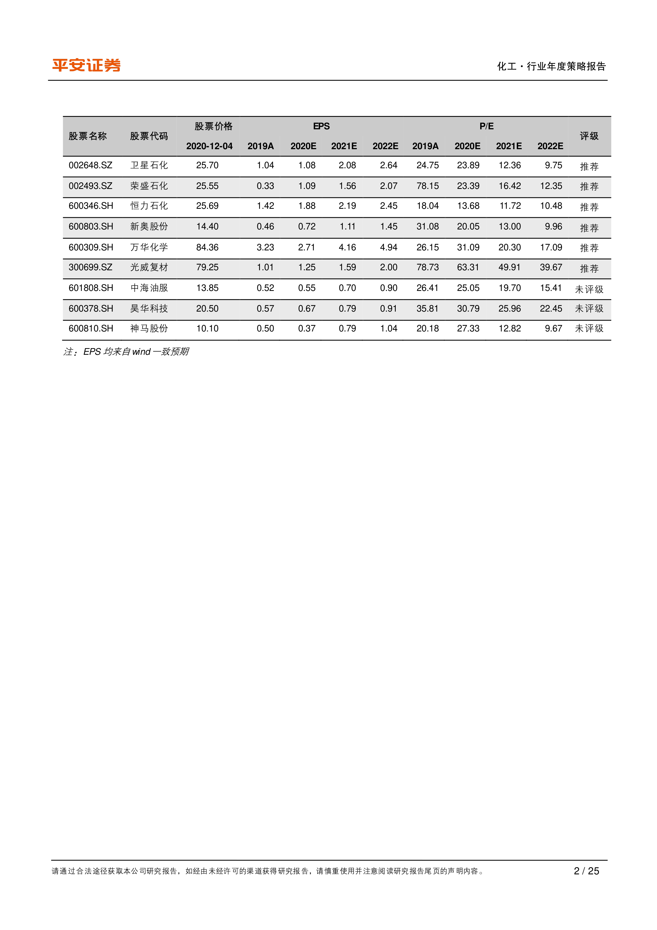 投资建议: 针对 2021 年 A 股的投资机会,我们建议从以下几条主线去把握: 1)油服:油服行业预计将会在油价回升的预期下具有良好的表现, 建议关注油服龙头中海油服。 2)天然气: 2021 年天然气需求有望持续回暖,长期看将继续保持高速增长的态势,推荐行业龙头新奥股份,公司在完成对新奥能源的资产重组后长期成长性可期。 3)一体化行业龙头:一体化行业龙头万华化学、恒力石化和荣盛石化凭借其产业协同效应、原材料议价能力或者科技创新能力,将继续引领相关子行业的发展。 4)短流程烯烃:短流程烯烃是在原料轻质化的背景下出现的烯烃生产新工艺,其“新”主要体现在产品高收率所带来的单位成本的降低, 2021 年卫星石化连云港一阶段项目的投产,预计将从业绩上再造一个“卫星石化”。 5)高端化工:大力发展化工新材料和高端精细化学品,将是“十四五”的两大重点任务。目前该领域受到政策大力支持和资本的助力,有望加速发展,建议关注电子特气龙头昊华科技、碳纤维龙头光威复材和尼龙 66 龙头神马股份。