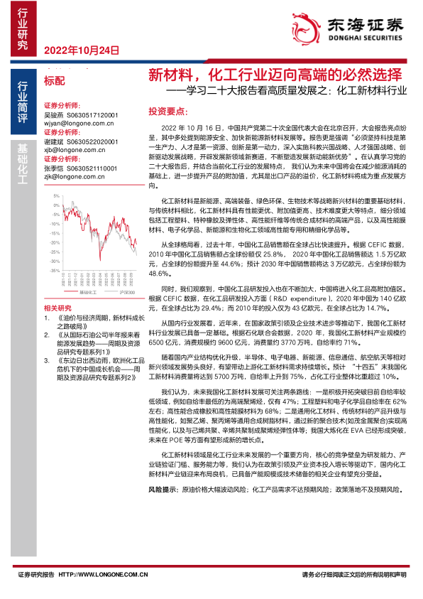 本报告基于对二十大报告精神的解读以及对中国化工新材料行业现状和发展趋势的分析,指出中国化工行业正经历从低端向高端的转型升级,新材料将成为未来发展的重要方向。 报告强调了国家政策的支持作用,并分析了行业发展面临的机遇和挑战。 报告最后给出了投资建议,建议关注具备产能规模或技术储备的企业,同时提醒投资者注意潜在的风险。 报告的数据主要来源于CEFIC和石化联合会等权威机构,具有较高的可靠性。 然而,报告也指出,未来发展仍存在不确定性,投资者需谨慎决策。