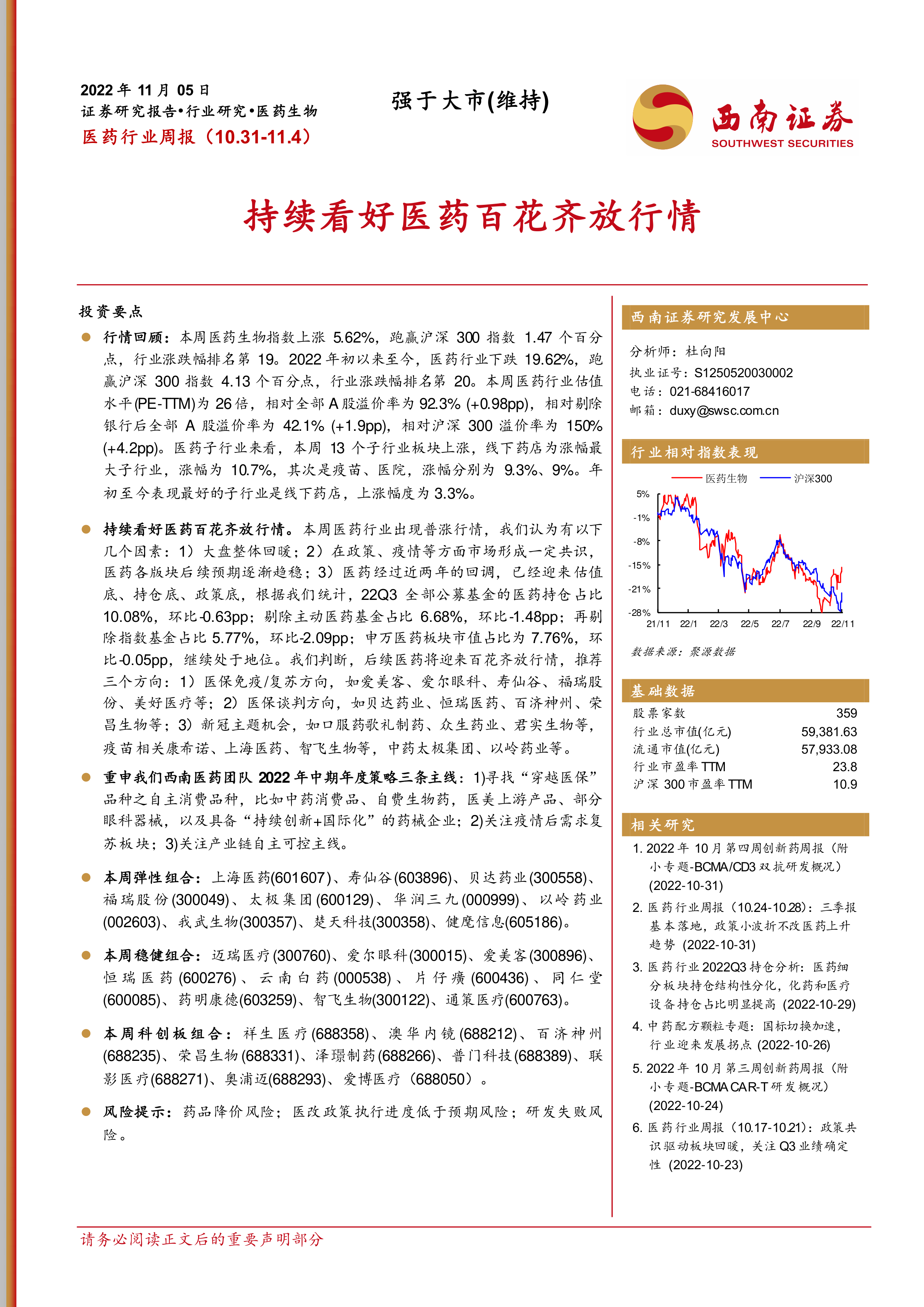 本报告的核心观点是:持续看好医药行业百花齐放的行情。基于以下几点原因:1)大盘整体回暖;2)政策、疫情等方面市场形成一定共识,医药各板块后续预期逐渐趋稳;3)医药行业经过近两年的回调,已迎来估值底、持仓底、政策底。报告推荐三个投资方向:医保免疫/复苏方向、医保谈判方向和新冠主题机会,并提供了相应的个股推荐组合。