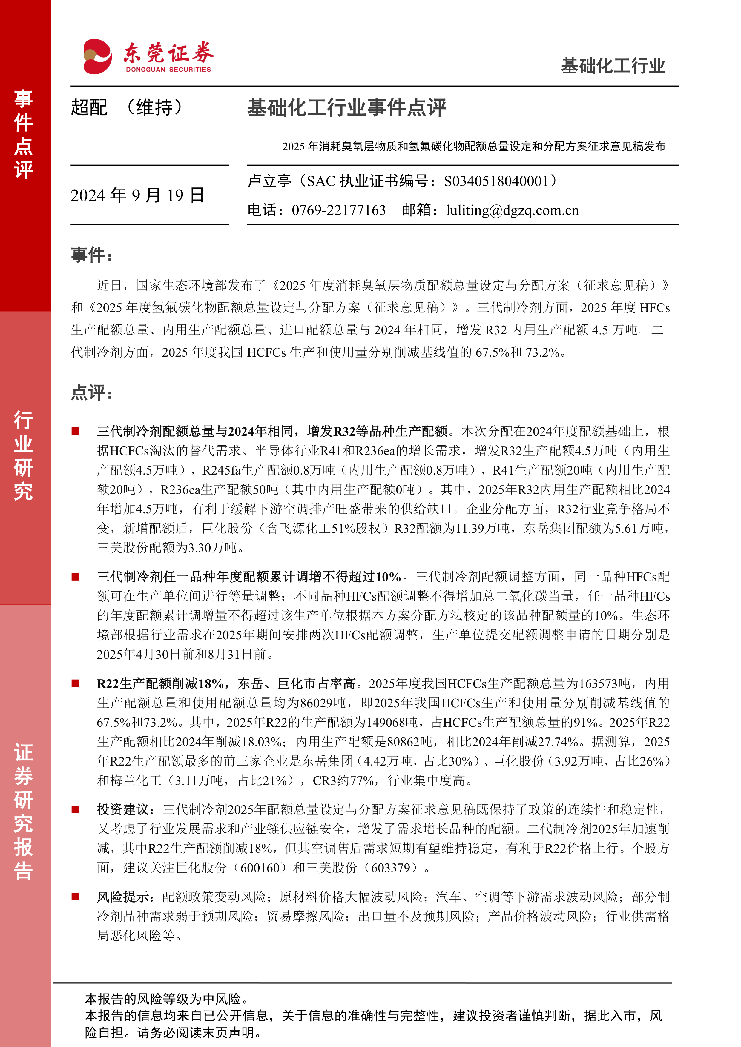 基础化工行业事件点评:2025年消耗臭氧层物质和氢氟碳化物配额总量设定和分配方案征求意见稿发布