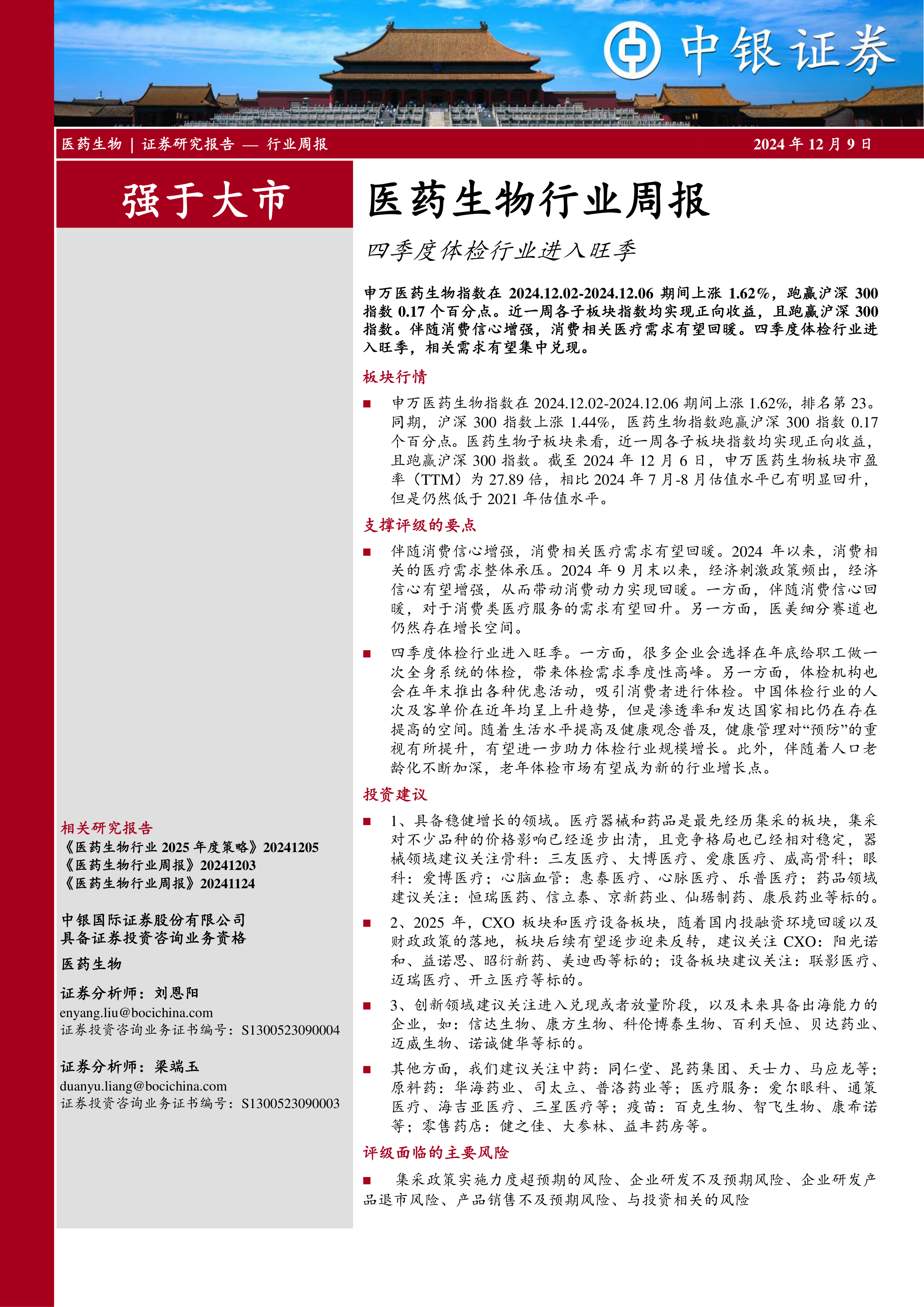 本报告基于近期市场数据,分析了申万医药生物指数及各子板块的运行情况,并对四季度体检行业旺季进行了深入探讨。报告认为,消费信心回暖和体检旺季是推动医药生物行业近期上涨的主要因素。报告最后给出了具体的投资建议,并提示了潜在的投资风险,为投资者提供了较为全面的市场分析和投资参考。 报告数据显示医药生物行业整体向好,但投资者仍需谨慎评估个股风险,并密切关注政策变化和市场动态。