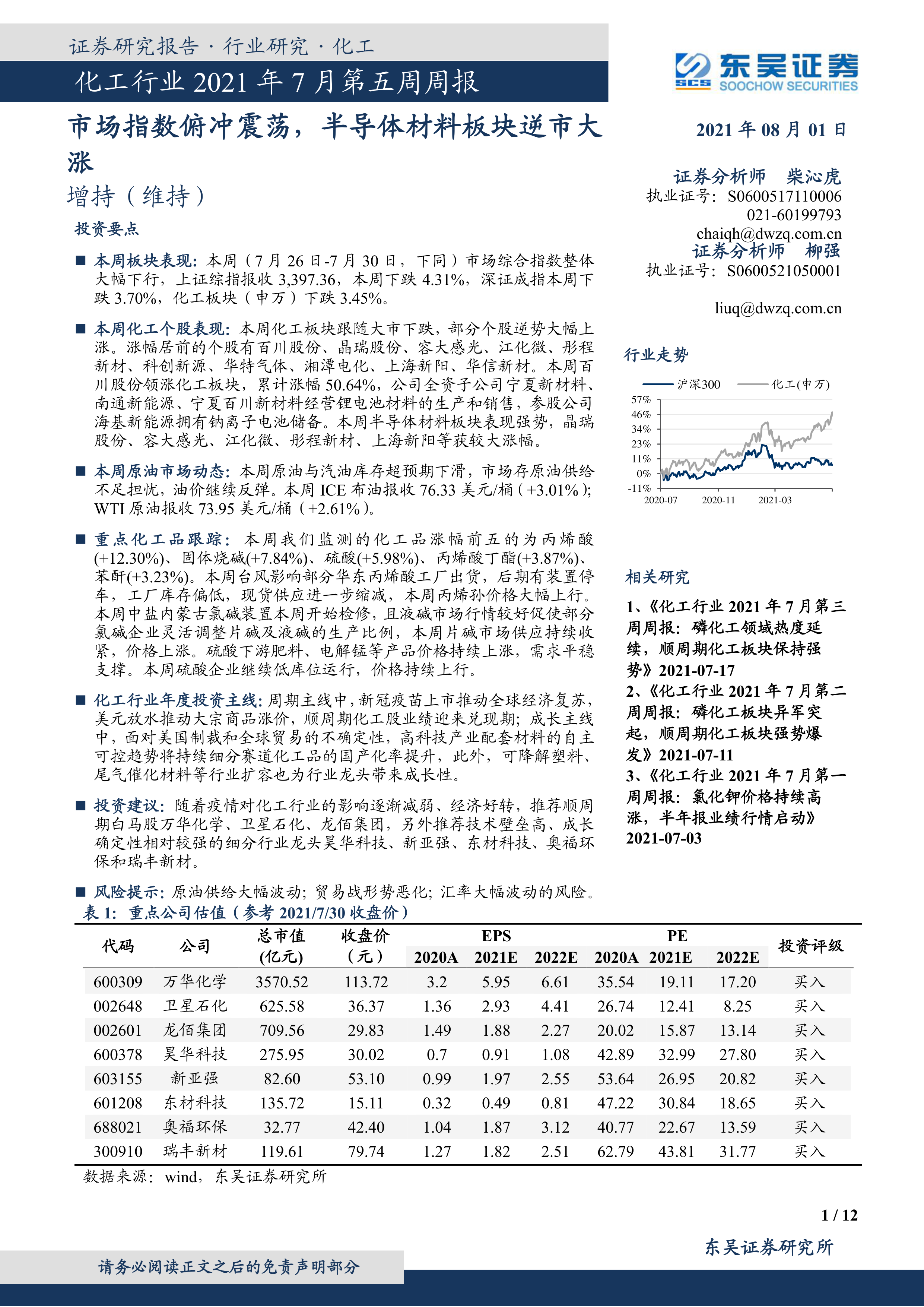 化工行业2021年7月第五周周报:市场指数俯冲震荡,半导体材料板块逆市大涨