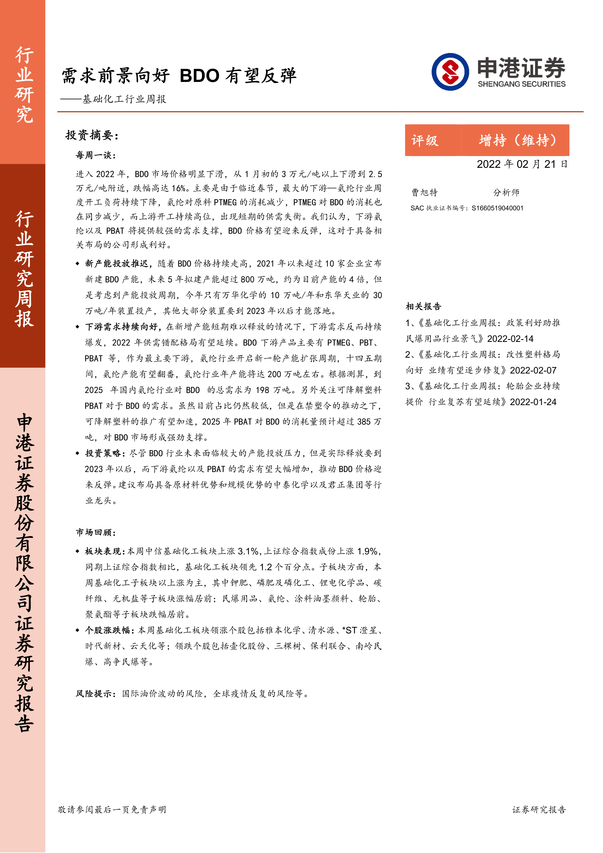 基础化工行业周报:需求前景向好 BDO有望反弹