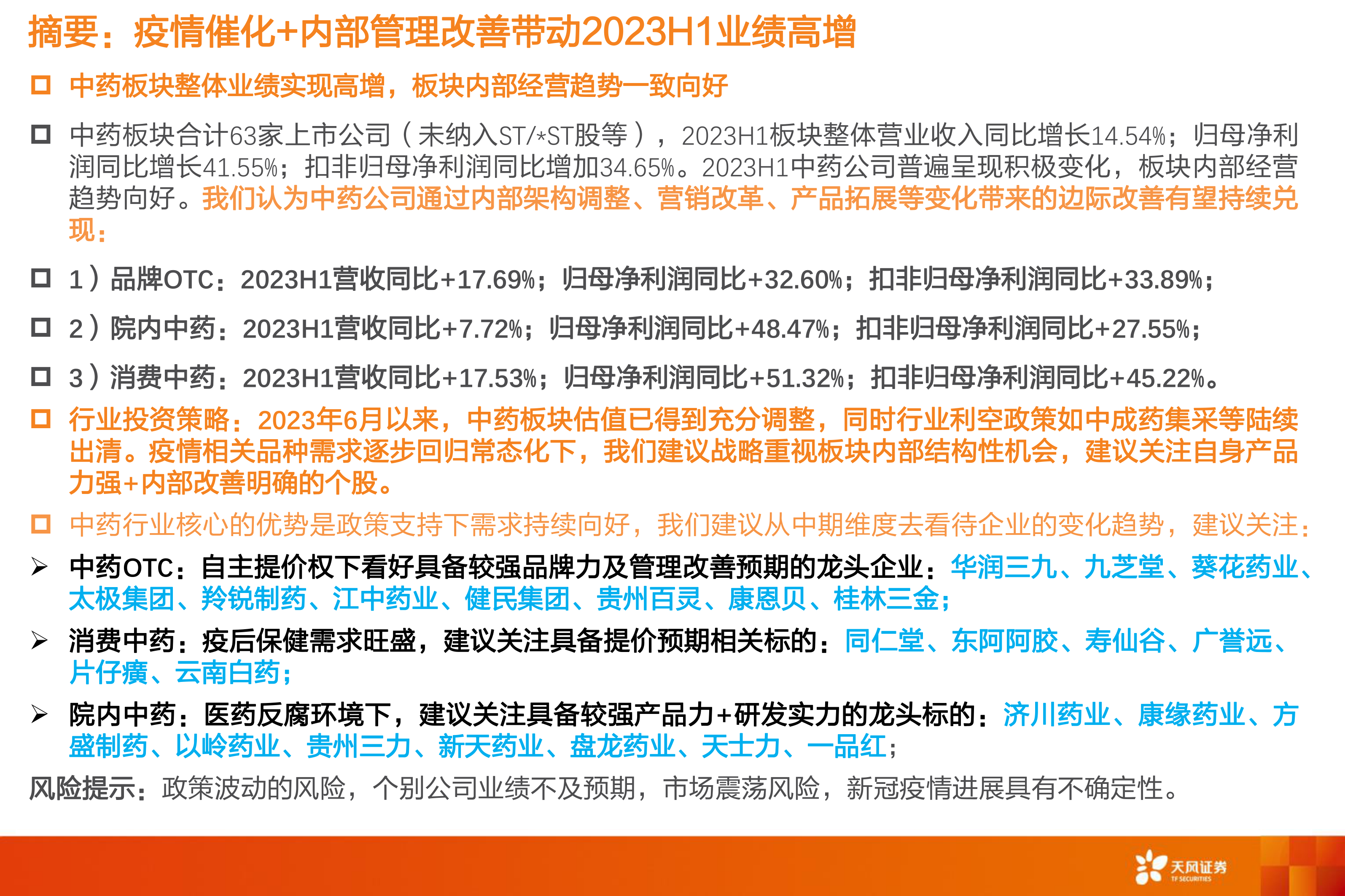 行业投资策略:2023年6月以来,中药板块估值已得到充分调整,同时行业利空政策如中成药集采等陆续出清。疫情相关品种需求逐步回归常态化下,我们建议战略重视板块内部结构性机会,建议关注自身产品力强+内部改善明确的个股。