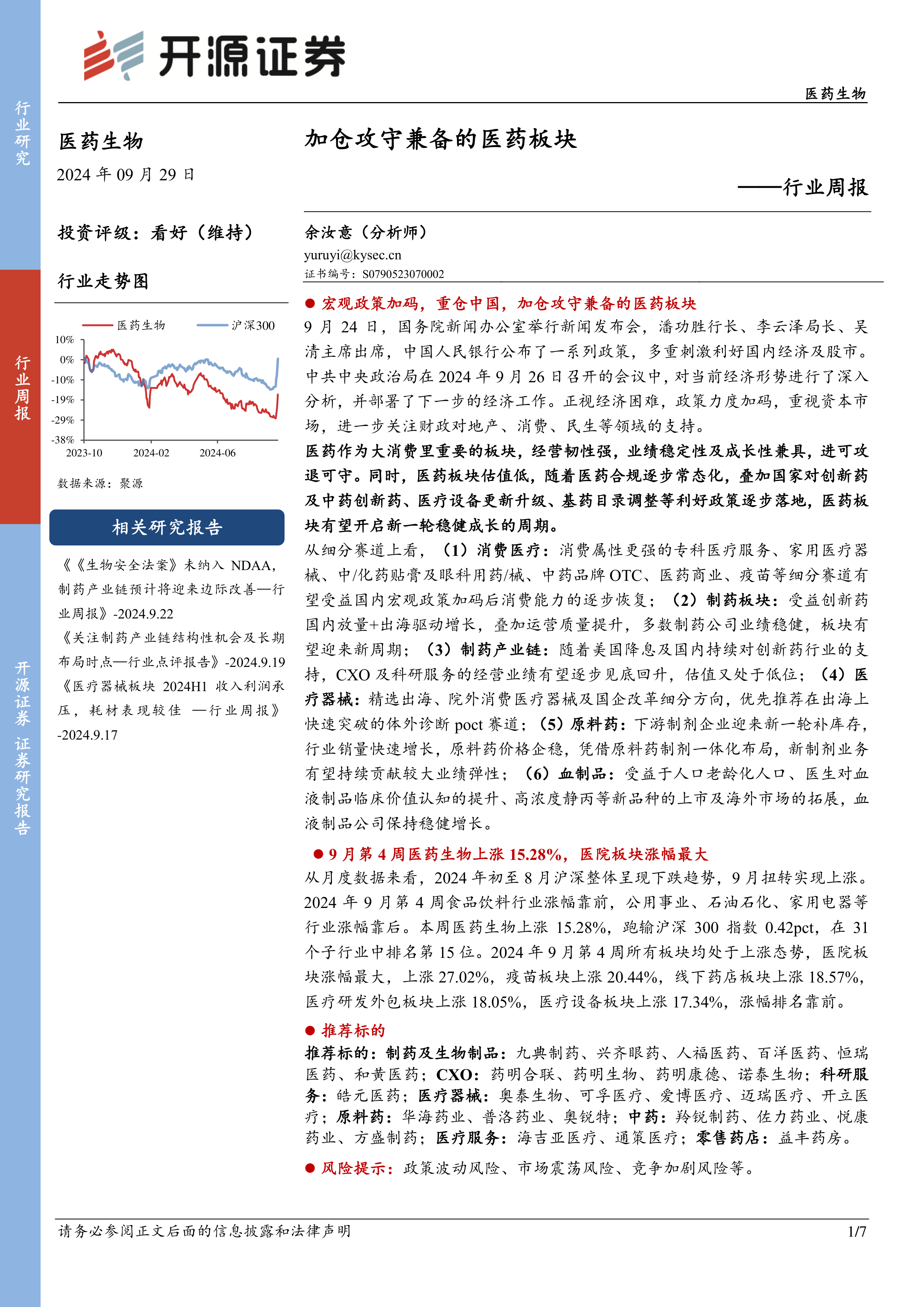 本报告基于宏观经济政策的积极变化和医药行业自身的良好基本面,对医药生物板块持乐观态度,并建议投资者加仓攻守兼备的医药板块。报告详细分析了板块整体行情和细分赛道的投资机会,并推荐了一系列具有投资价值的标的。 然而,投资者仍需关注报告中提到的政策波动、市场震荡和竞争加剧等风险因素,谨慎决策。 报告数据主要来源于Wind和开源证券研究所,时间截止至2024年9月27日。 需要注意的是,本报告的投资评级和建议仅供参考,不构成投资建议,投资者应根据自身情况进行独立判断。